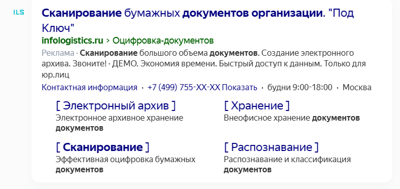 По итогу, средняя позиция показа объявлений не ниже 2-й позиции в поисковой выдаче. Если пользователь вводит в поисковой строке «оцифровать документы», то он сразу же получает рекламные объявления по своему запросу.