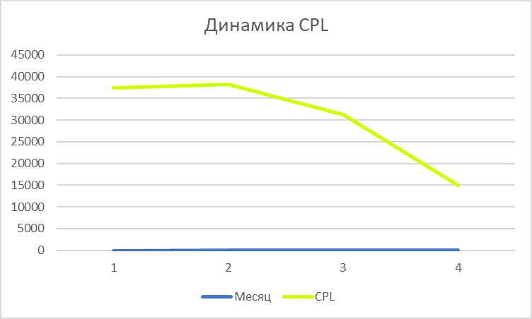 К 4 месяцу работы мы смогли увеличить количество целевых лидов на 200% по сравнению с 1 месяцем. Если CPL в 1 месяце был 37.400 руб, то в последнем составил 15.000 руб.