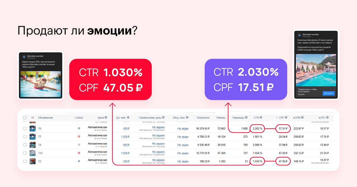 Пример: одно из курортных сообществ ВКонтакте запускало рекламу только на Екатеринбург и ближайшие города. После анализа выяснилось, что значительная часть бронирований приходила от жителей других регионов. Расширение таргетинга увеличило охват, привело больше бронирований и, что важно, повысило выручку курорта.