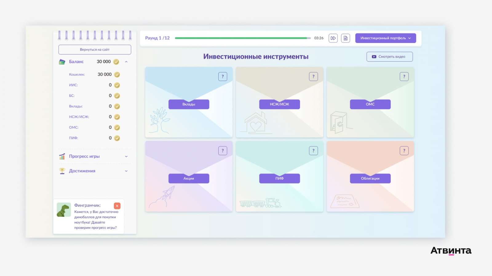 Например, для портала финансовой грамотности мы создали симулятор инвестиционного рынка с динозавром в главной роли. Разработку игры курировали: Региональный центр финансовой грамотности, налоговые органы, Центральный Банк (в роли приглашенного эксперта). И с каждой стороны — по несколько согласующих. Чтобы вы понимали, на одном из собраний было 20 ЛПРов.