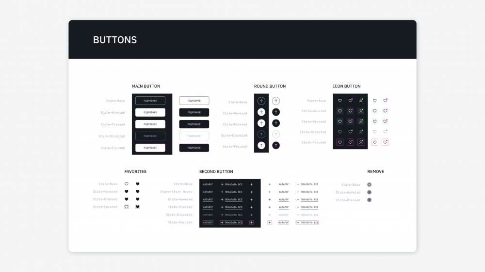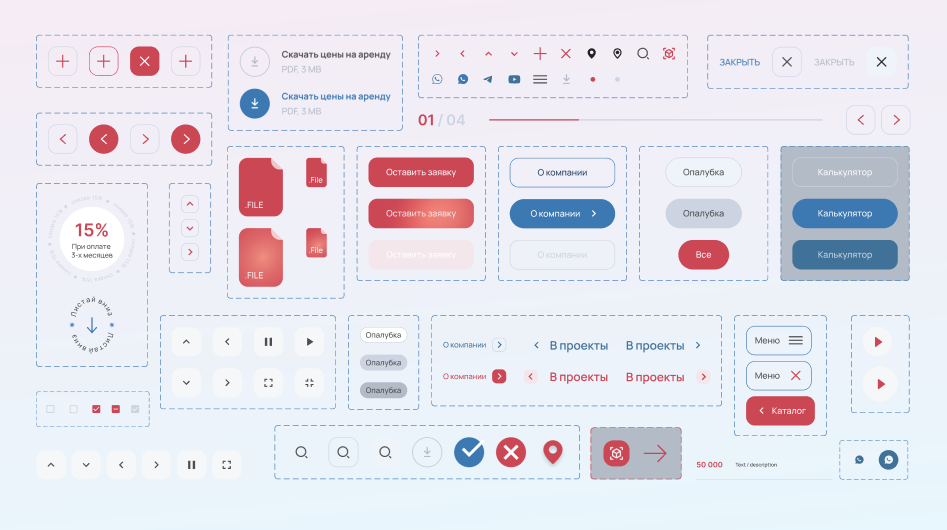 Кнопки помогают аудитории взаимодействовать с сервисом: перейти в другой раздел, открыть форму заявки, купить товар, зарегистрироваться и тому подобное. В UI-кит добавляют различные типы кнопок: с иконками и призывами к действию.