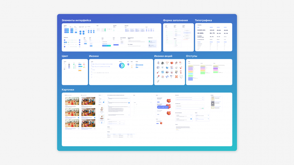 Далее создаем концептуальные объекты: цветовые сочетания, оформление текста, модульная сетка. Разрабатываем базовые элементы интерфейса: кнопки, иконки и инпуты. Из них дизайнер собирает сложные компоненты и шаблоны.