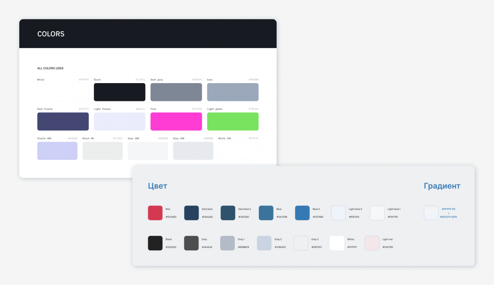 В UI-кит цвета добавляют с обозначением RGB и HEX-кодов. Так всем участникам команды удобнее копировать оттенки и поддерживать баланс на макетах проекта.
