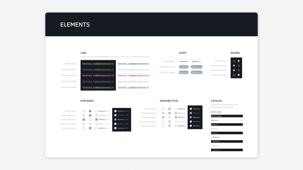 Структурируем полученный UI kit и разделяем на категории: типографика, кнопки, формы и другие. Так любой член команды сразу сможет понять, откуда нужно взять компонент.