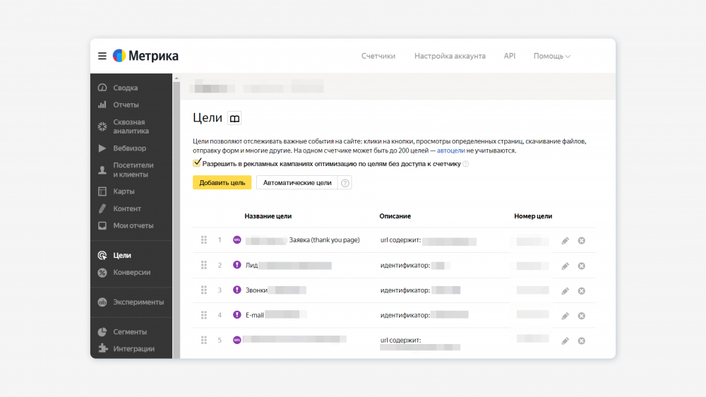 В Яндекс.Метрике настраивают цели для отслеживания динамики.