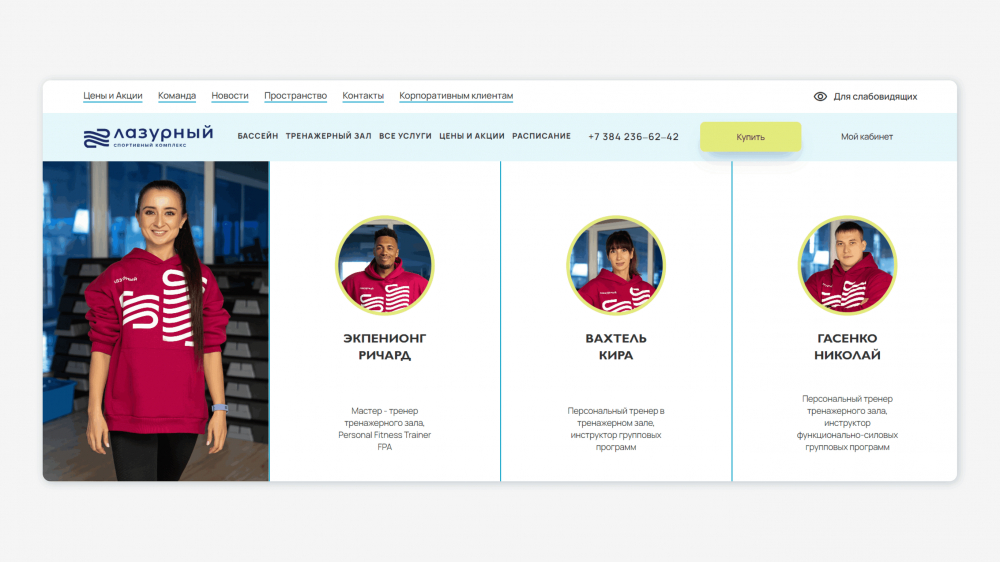 На сайте спортивного центра «Лазурный» мы добавили качественные фотографии тренеров, чтобы потенциальным клиентам было легче решиться на первое посещение или отдать ребенка в группу.