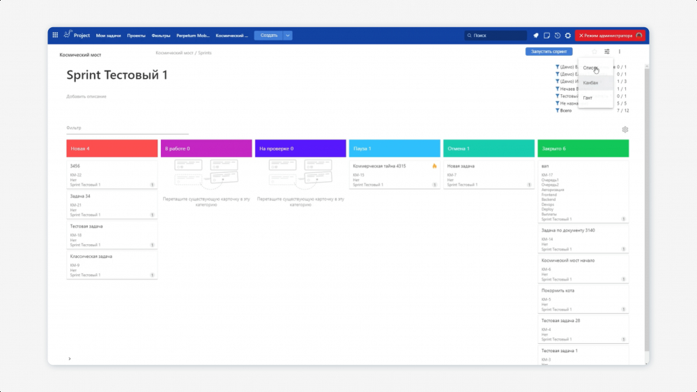 - Канбан можно трансформировать в диаграмму Ганта и календарь.