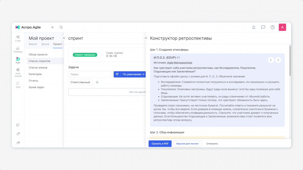 - Конструктор ретроспектив — помогает создавать сценарии для каждого этапа встречи и обсуждать с командой результаты работы.