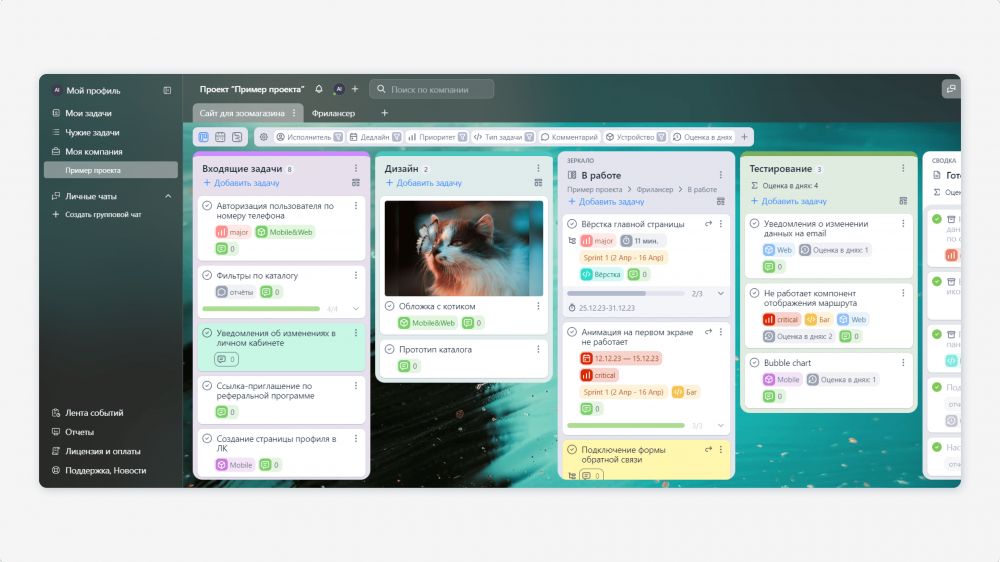 - Организация и ведение нескольких досок в одном рабочем пространстве.
