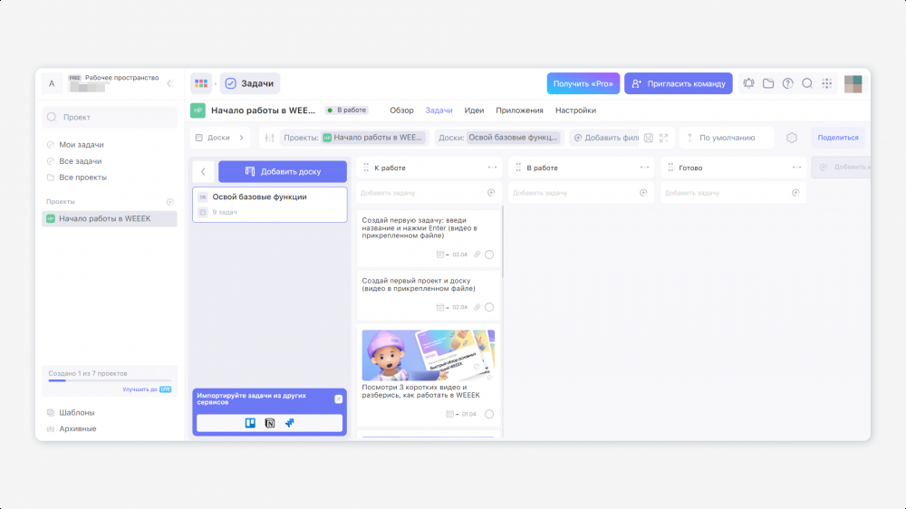 - В бесплатной версии можно создать 7 проектов и 10 досок для каждого из них.