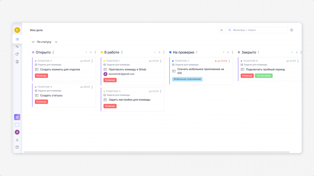 В первом случае удобно отслеживать отделы и команды без нагромождений других функций, во втором же вся информация защищена от утечки — и с приходом нового сотрудника вам будет проще дать доступы к конкретным разделам системы.