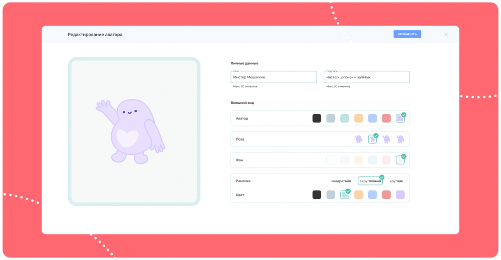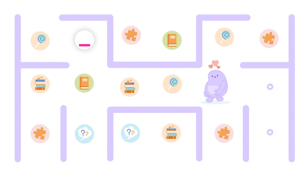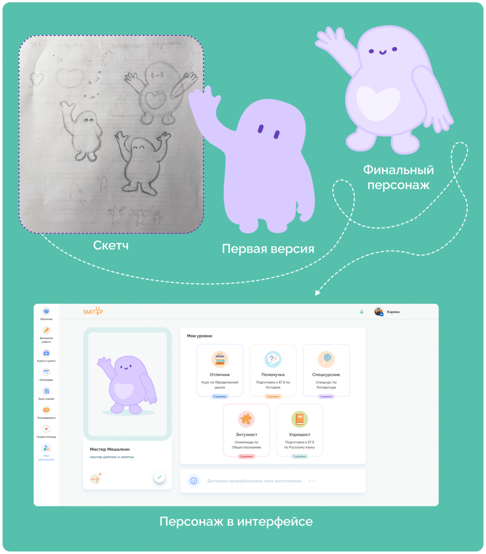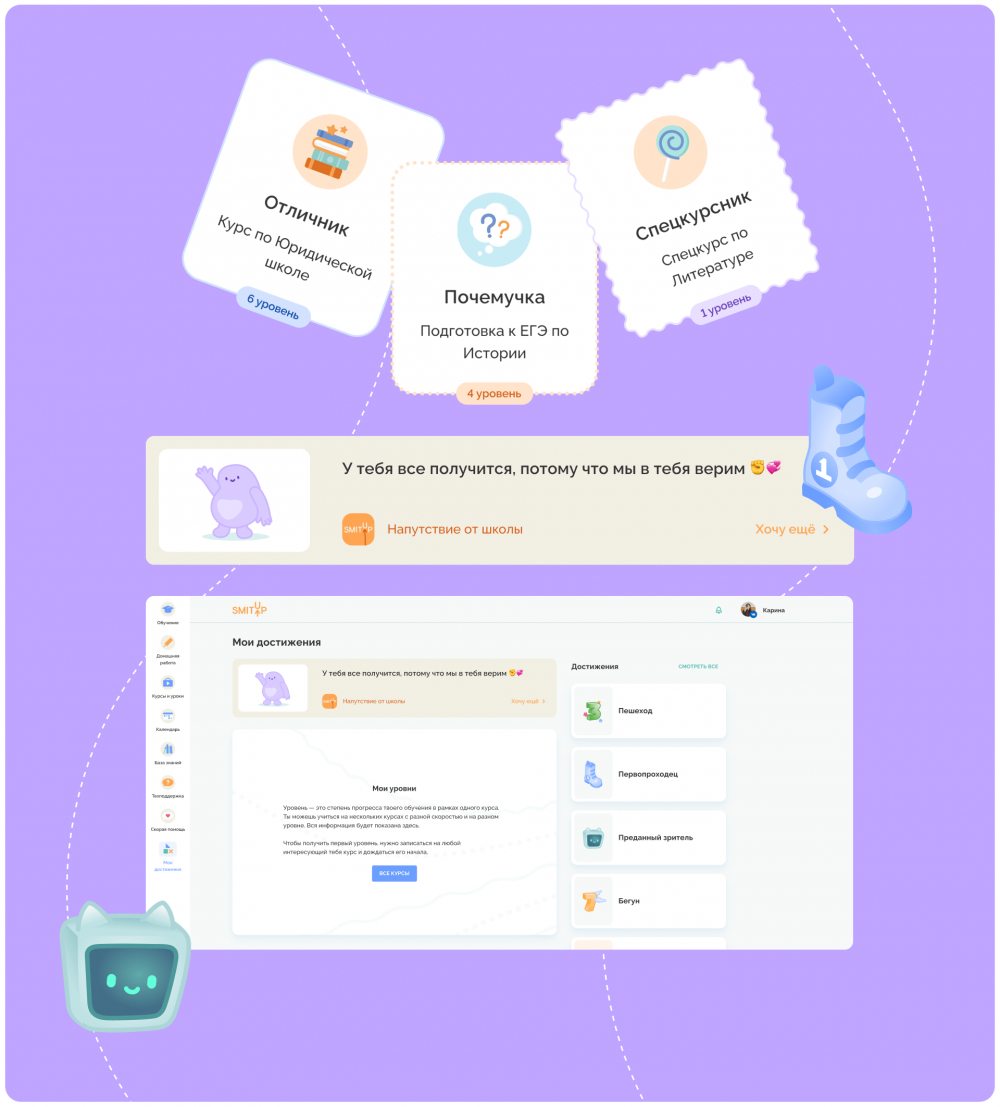Cоздали друга, который поддерживает учеников мотивирующими фразами. Персонаж разработан все в той же мягкой и дружелюбной стилистике.