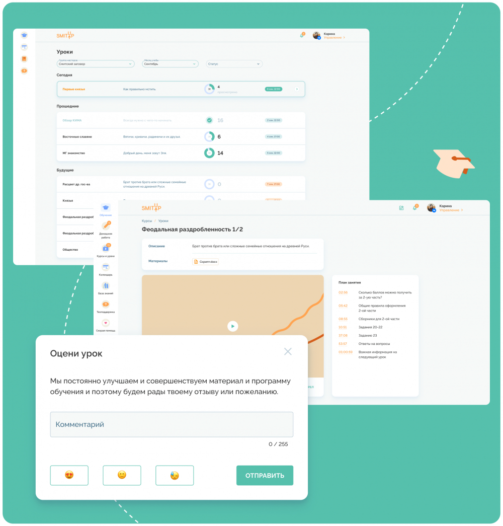 Наш заказчик — онлайн-школа подготовки к ЕГЭ SMITUP. С компанией работаем уже 3 года. За это время с нуля разработали и внедрили образовательную платформу, в которой можно смотреть уроки, выполнять домашние задания и готовиться к экзаменам. Внутри сервиса — более 100 курсов разного формата по 8 предметам.