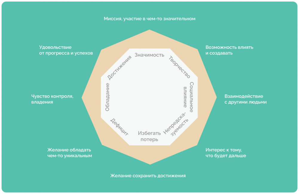 В основе геймификации обучения лежит система Ю-Кай-Чоу. Она базируется на 8 видах потребностей, которые мотивируют включаться в процесс и активнее взаимодействовать с интерфейсом.