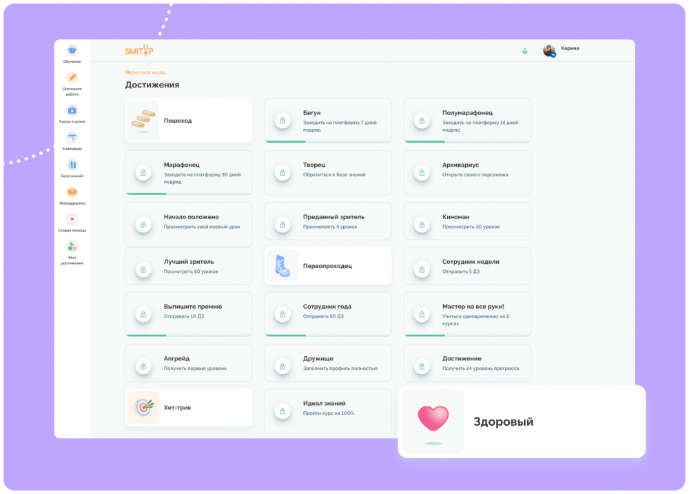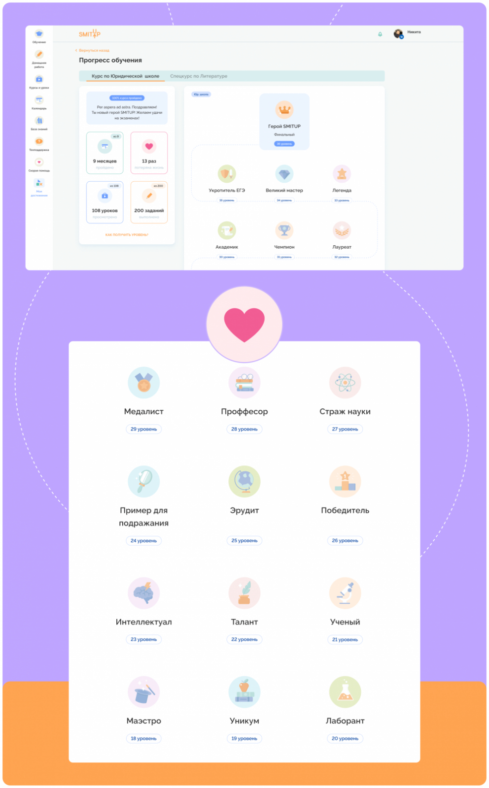 Систему уровней отразили в виде карты. Это создает ассоциацию с приключениями и квестами. У каждого уровня — своя иконка и уникальное тематическое название, например: «Укротитель ЕГЭ», «Герой SMITUP», «Лаборант». Такие формулировки еще больше погружают в атмосферу обучения.