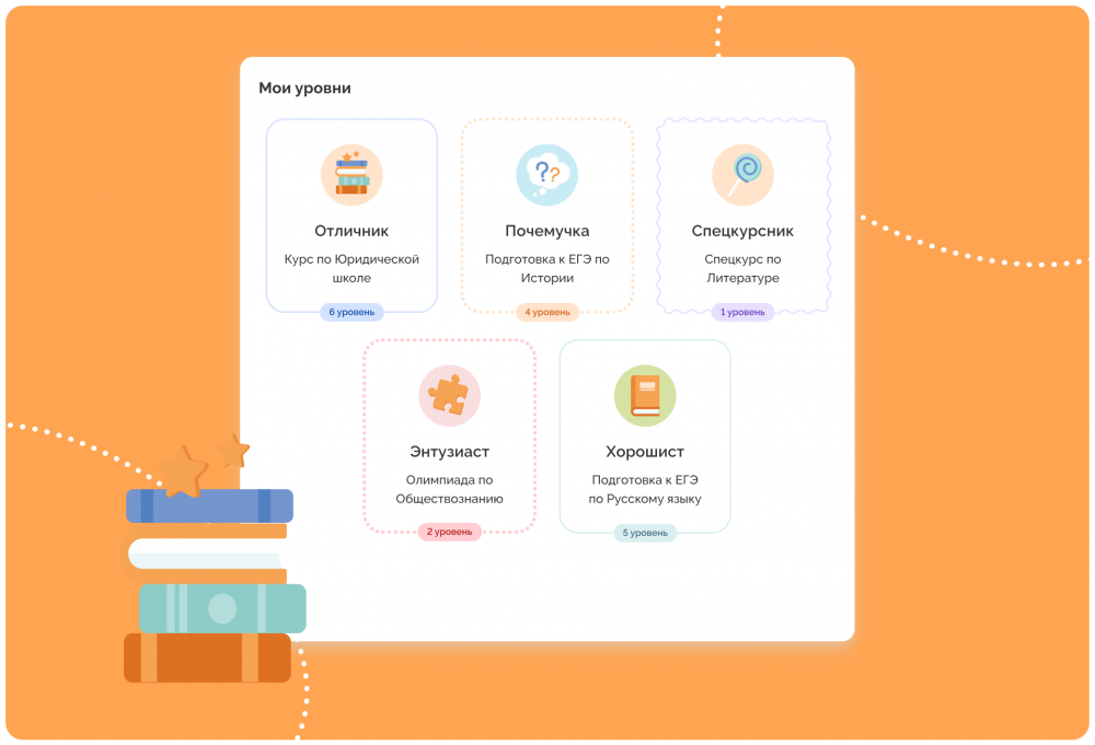 Мы разработали систему из 36 уровней. Чтобы повысить левел, ученик должен посмотреть определенное количество уроков и выполнить нужное количество заданий — это ключевые критерии прогресса по курсу. Для присвоения уровней на бэке добавили функционал, который собирает данные пользователя и рассчитывает левел по специальной формуле.