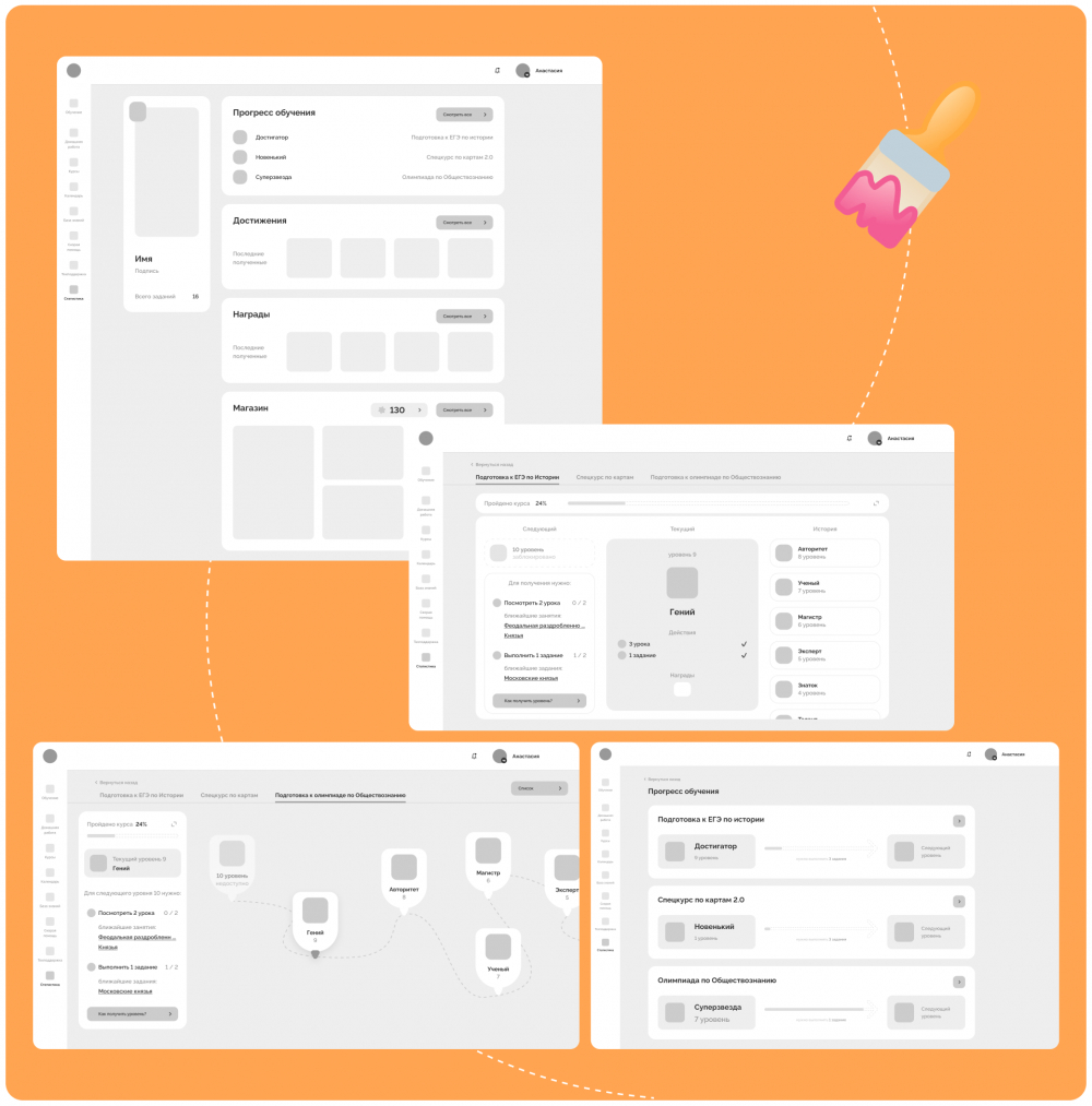 Сначала разработали прототипы, на которых отразили функционал системы уровней и достижений.