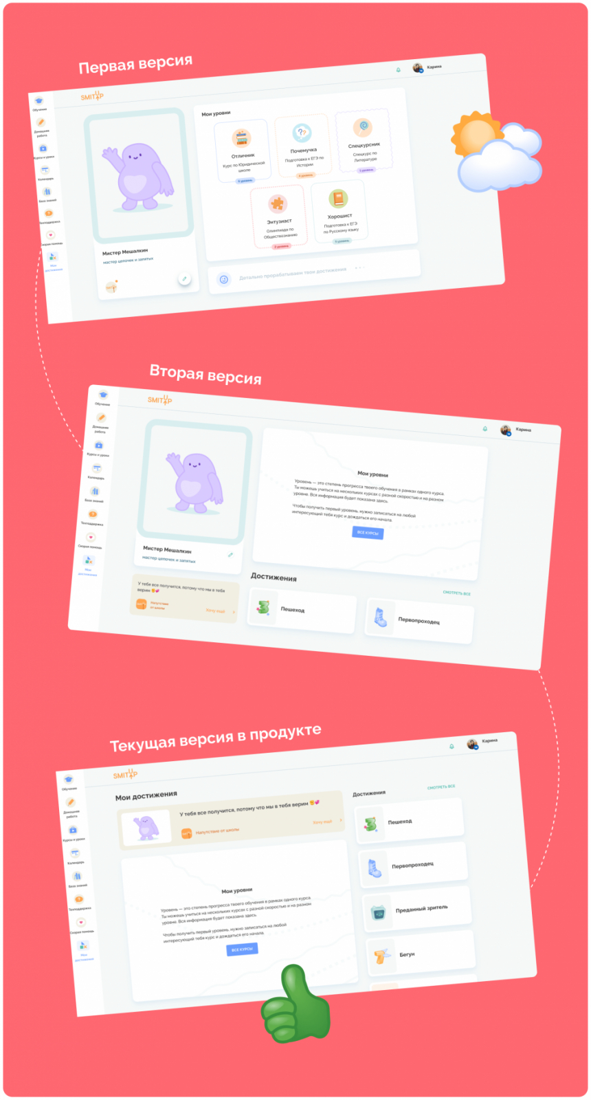 Разработка продуктов отличается гибкостью — команда может менять решения, фокус и пробовать разные гипотезы. Так было и в нашей игрофикации — во время работы решили сместить акцент с персонажа и уделить больше внимания ачивкам и уровням. Поэтому в процессе макет раздела несколько раз менялся.