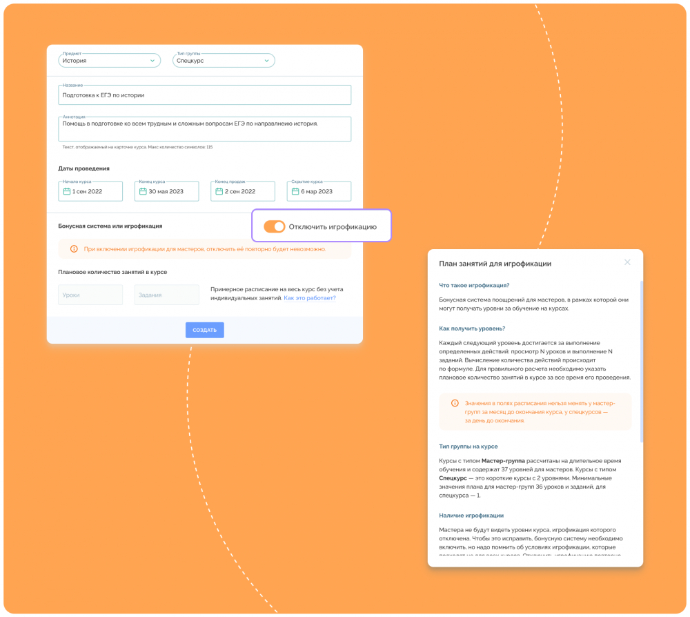 Кроме нового раздела игрофикацию нужно было отразить в конструкторе, где методисты собирают обучающие программы. Для этого добавили специальный тумблер на этапе создания курса.
