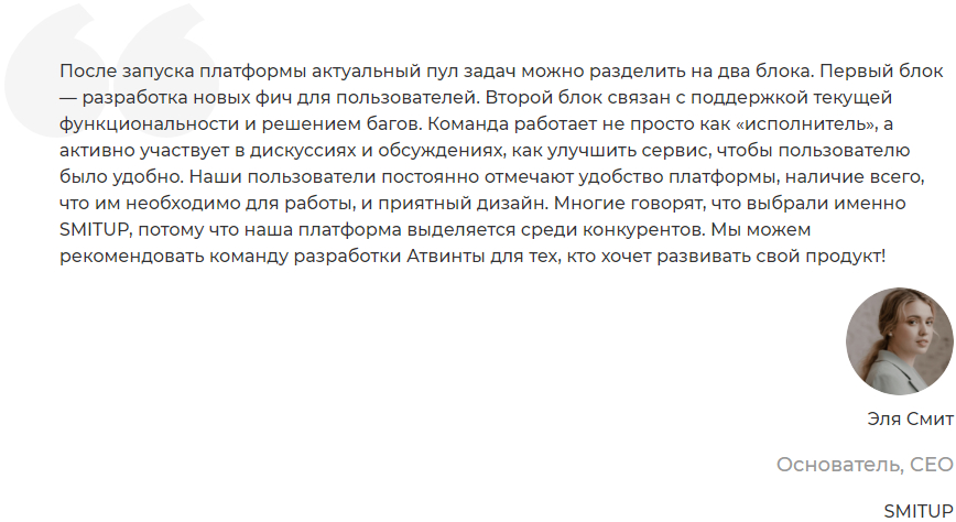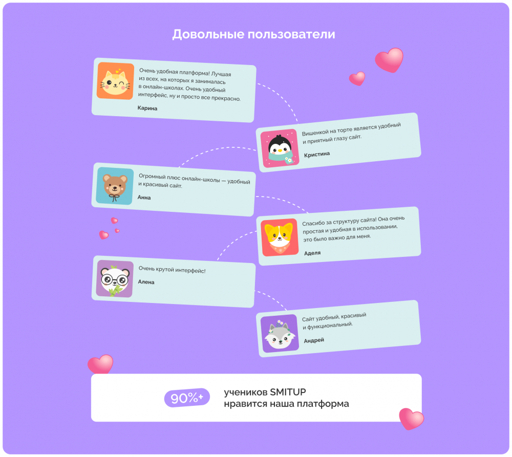 Согласно опросу клиента, средняя оценка удобства платформы учениками равняется 90%. А вот цитаты из отзывов в социальных сетях SMITUP — пользователям нравится наш личный кабинет :)