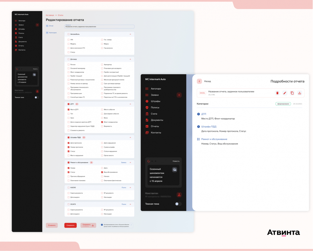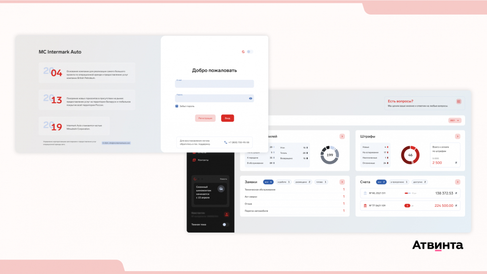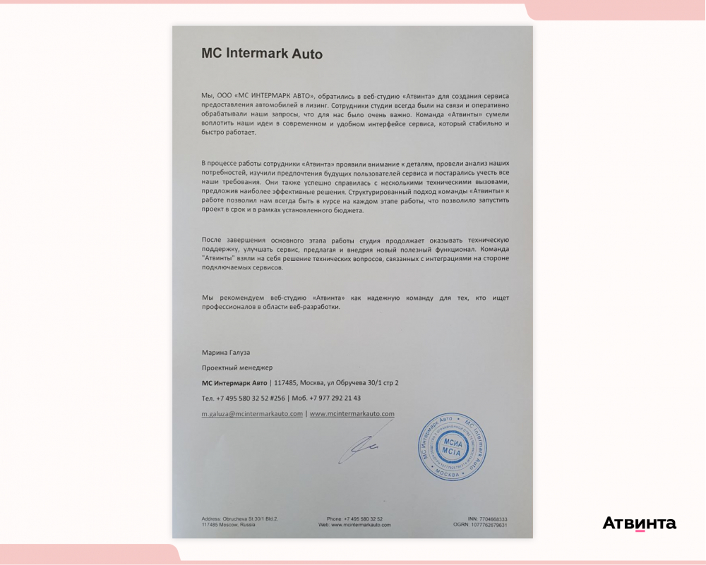 "Мы, в ООО MC Intermark Auto, обратились в веб-студию Атвинта для создания сервиса предоставления автомобилей в лизинг. Сотрудники студии всегда были на связи и оперативно обрабатывали наши запросы. Команда Атвинты сумела воплотить наши идеи в современном и удобном интерфейсе сервиса, который стабильно и быстро работает. В процессе работы сотрудники Атвинты проявили внимание к деталям, провели анализ наших потребностей, изучили предпочтения будущих пользователей сервиса и постарались учесть все наши требования. Они также успешно справились с несколькими техническими вызовами, предложив наиболее эффективные решения. Структурированный подход команды Атвинты к работе позволил нам всегда быть в курсе на каждом этапе работы, что позволило запустить проект в срок и в рамках установленного бюджета. После завершения основного этапа работы студия продолжает оказывать техническую поддержку, улучшать сервис, предлагая и внедряя новый полезный функционал. Команда Атвинта взяла на себя решение технических вопросов, связанных с интеграциями на стороне подключаемых сервисов. Мы рекомендуем веб-студию Атвинта как надежную команду для тех, кто ищет профессионалов в области разработки." - Марина Галуза, проектный менеджер МС Интермарк Авто.
