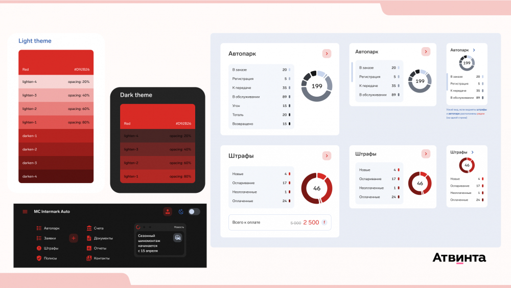 Затем сделали дизайн-концепцию в двух темах — светлой и темной. Главным и контрастным цветом стал красный.