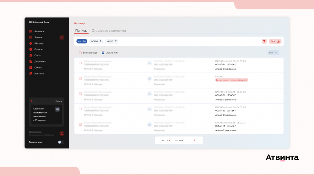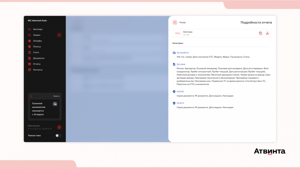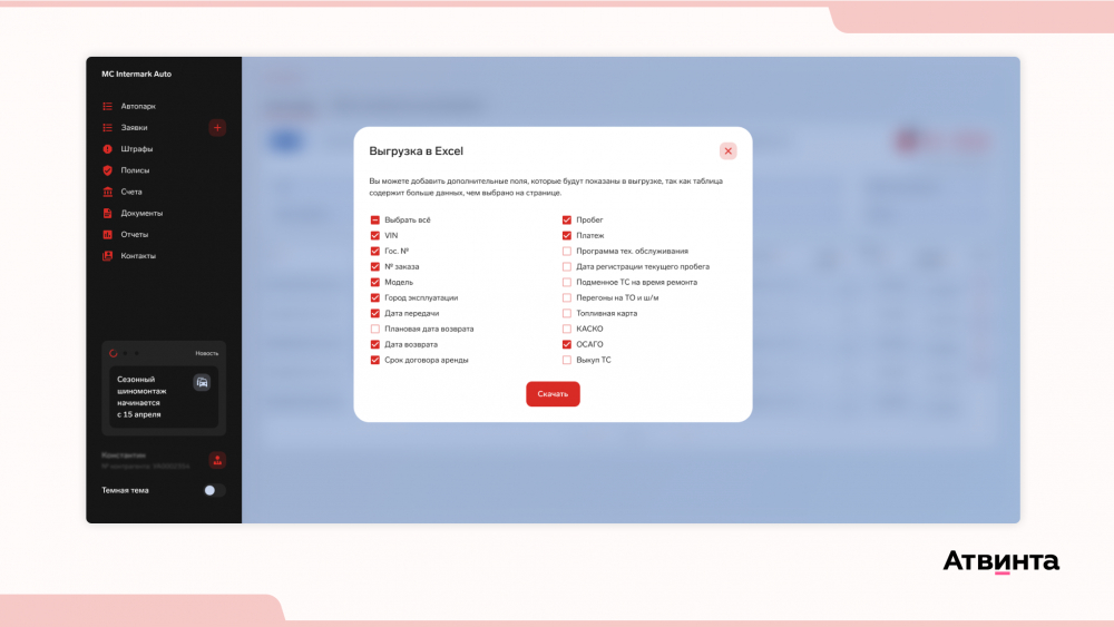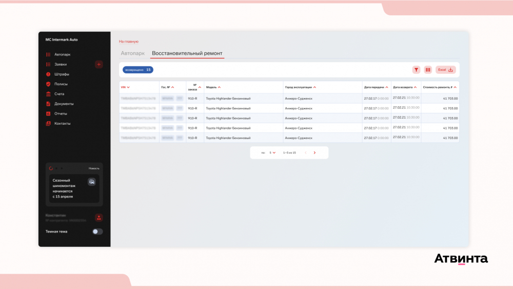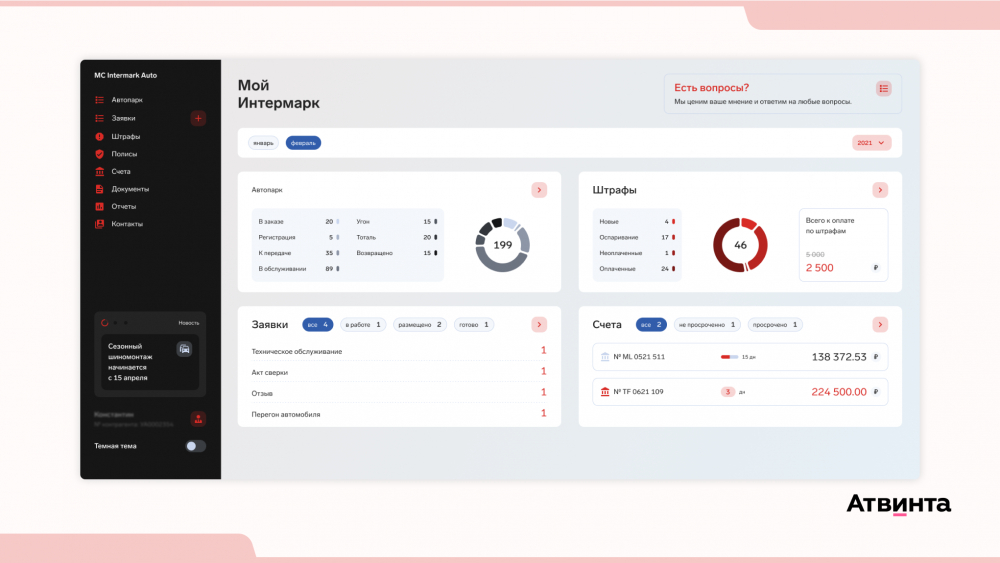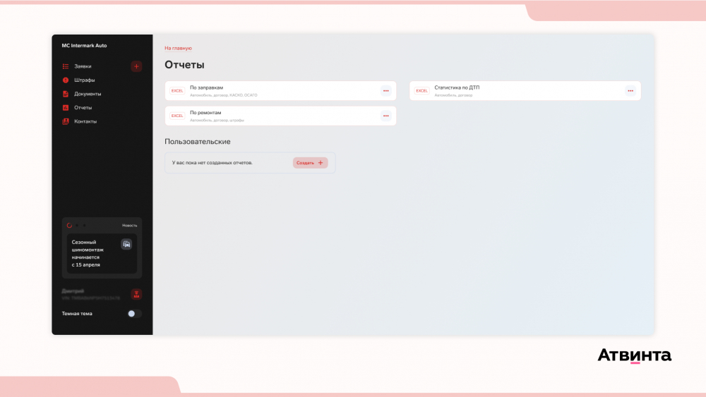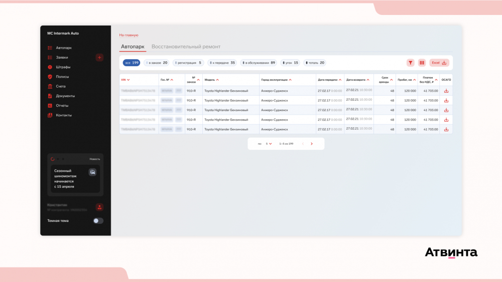 По основной структуре кабинет не отличается от аккаунта флит-менеджера. Здесь также можно выбирать виджеты, сортировать и выгружать таблицы, видеть актуальные предложения и обращаться за помощью к сотрудникам MC Intermark Auto.