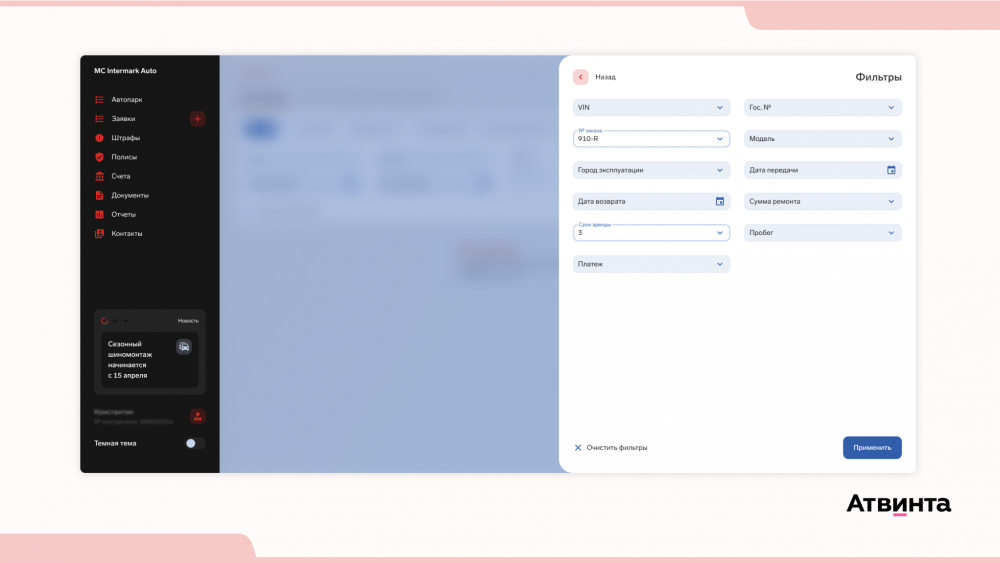 С помощью фильтров можно отсортировать машины и быстро найти транспортное средство. Например, ввести VIN, государственный номер, дату возврата или пробег. Это удобно, когда у менеджера большой автопарк и ему требуется проверить несколько ТС или конкретную модель.
