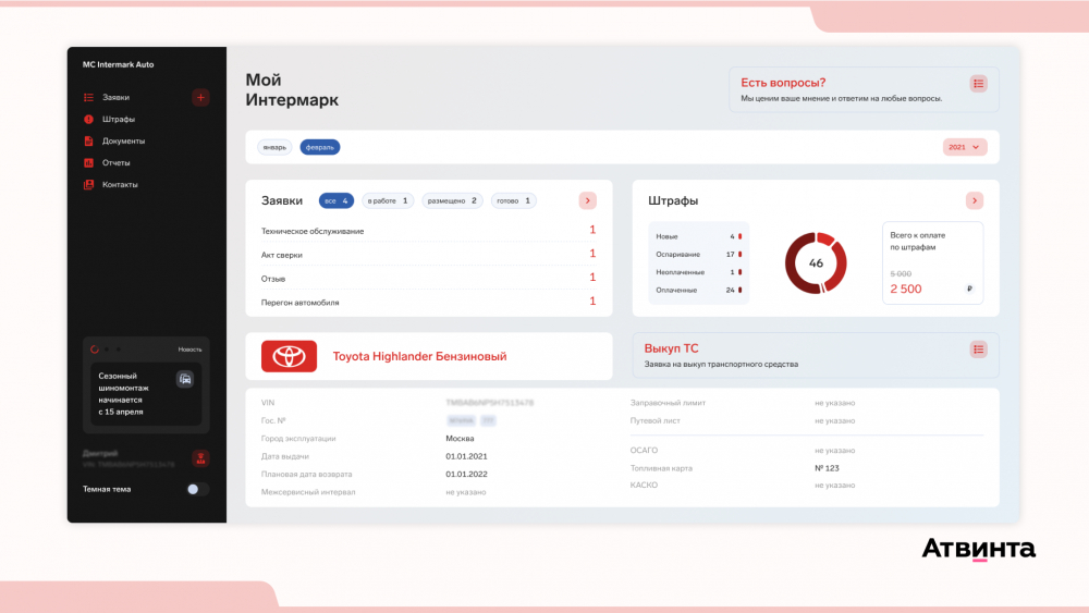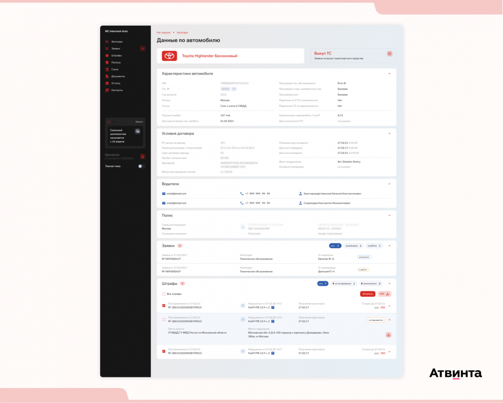 На дашборде высвечиваются виджеты по заявкам и штрафам, а ниже дана информация о транспортном средстве. Пользователь может нажать на нее и перейти в более подробную карточку машины. Она выглядит так же, как и в личном кабинете флит-менеджера.