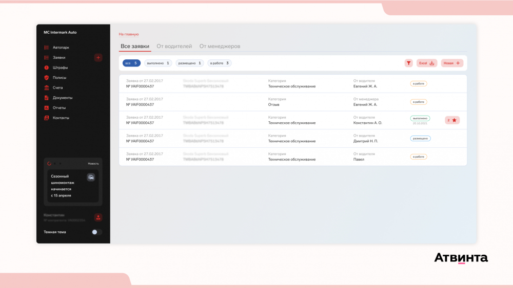 В этой вкладке пользователь отслеживает все заявки — например, свежие или те, что находятся в работе. Система работы с таблицей та же, что и с данными по автопарку — можно сортировать колонки и выгружать информацию.