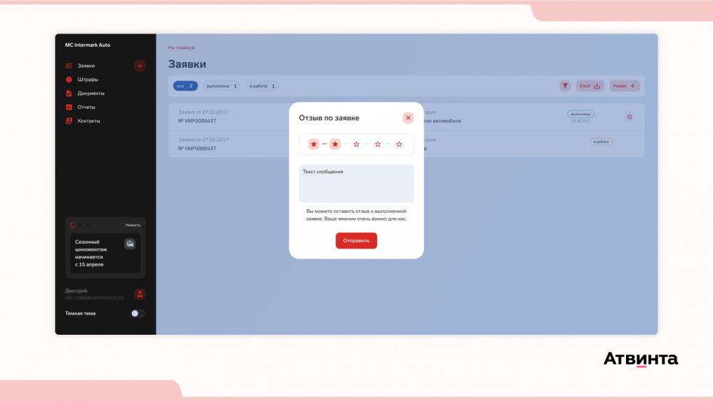 Чтобы компании MC Intermark Auto отслеживать свою работу и качество услуг поставщиков — пользователь может поставить оценку и написать отзыв о предоставленном сервисе.
