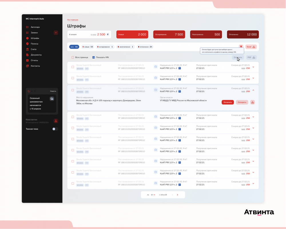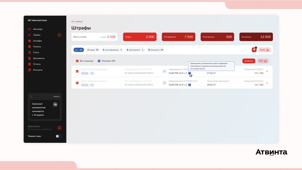 В данной вкладке можно найти полную информацию по штрафам: новые, оплаченные, обжалованные и неоплаченные. В таблице также есть фильтр и выгрузка данных в формате XLSX и PDF.