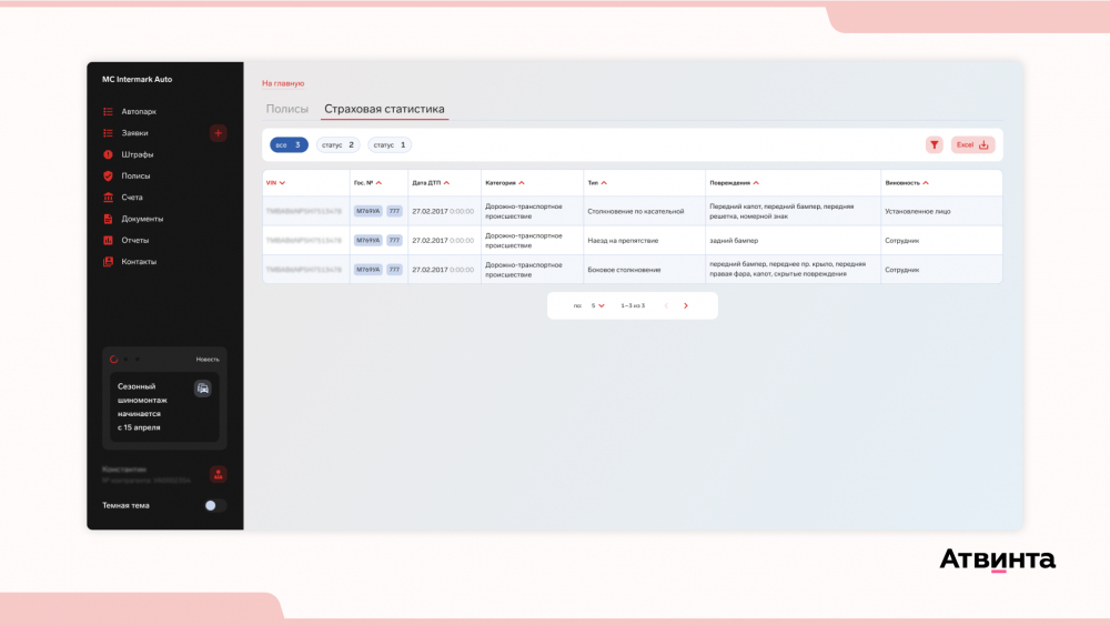 Во вкладке со страховой статистикой можно отследить аварийные случаи, типы повреждений и виновное лицо.