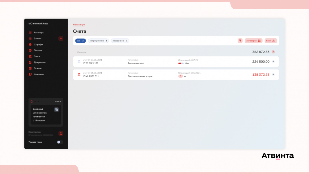 В данном разделе находится информация по активным и просроченным счетам за услуги MC Intermark Auto. Например, аренда автомобиля или предоставление услуг от поставщиков — ТО, перевозка машины в другой регион или ремонт.