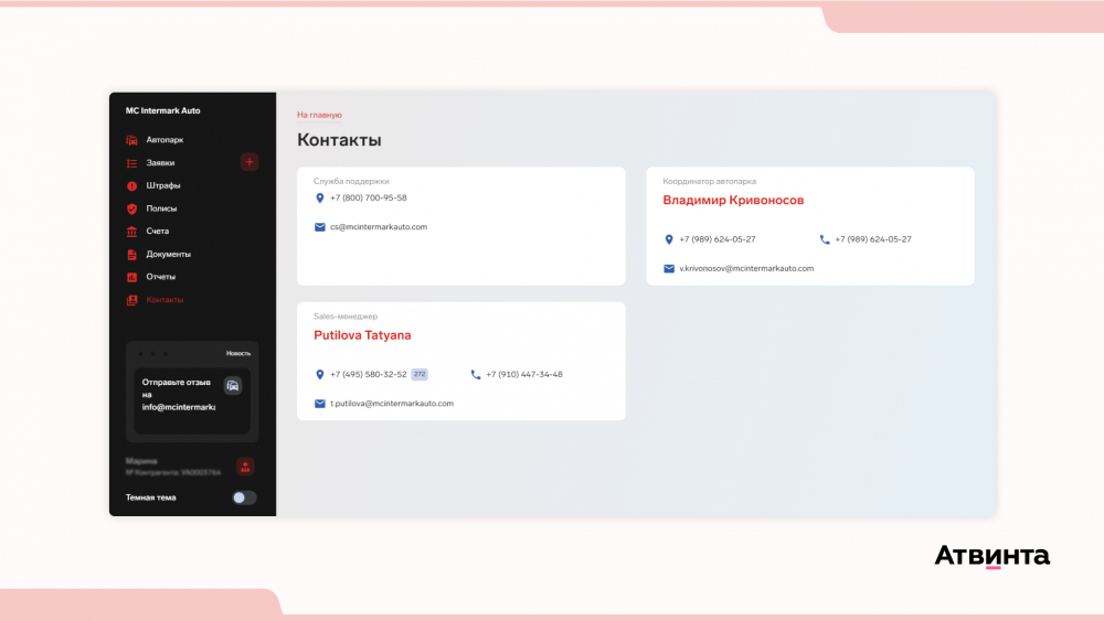 В последнем разделе управляющий автопарком может найти контактные данные менеджеров компании, чтобы связаться с ними и решить проблему.