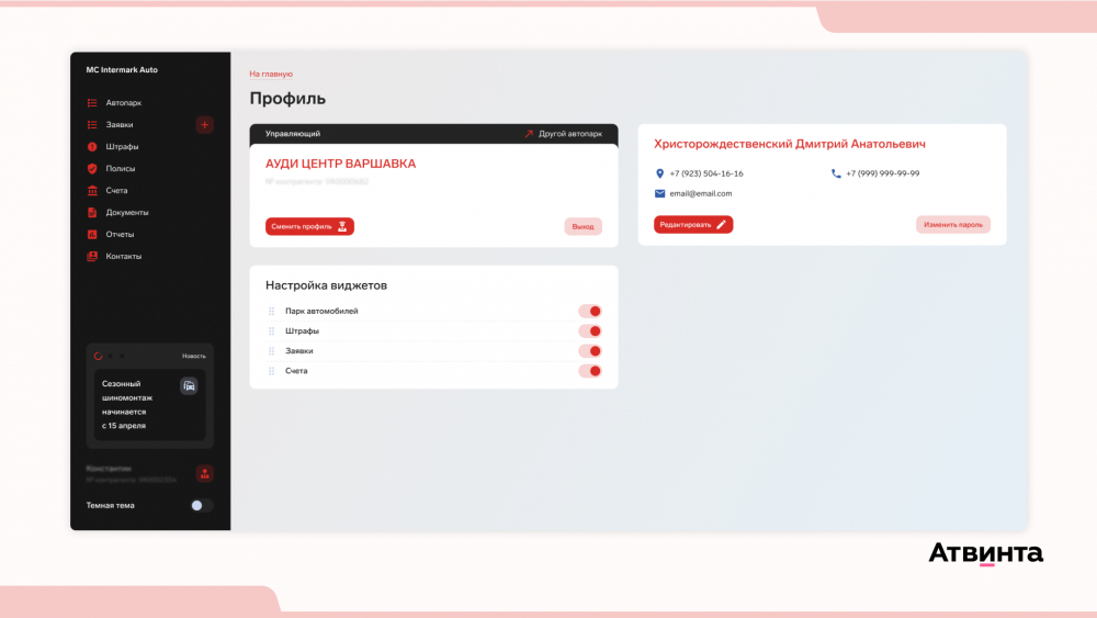 Также в меню есть доступ для переключения темы и переход в профиль, в котором находится информация о контрагенте и настройки виджетов для дашборда. Если у пользователя изменился телефон и email, он может отредактировать свои данные.