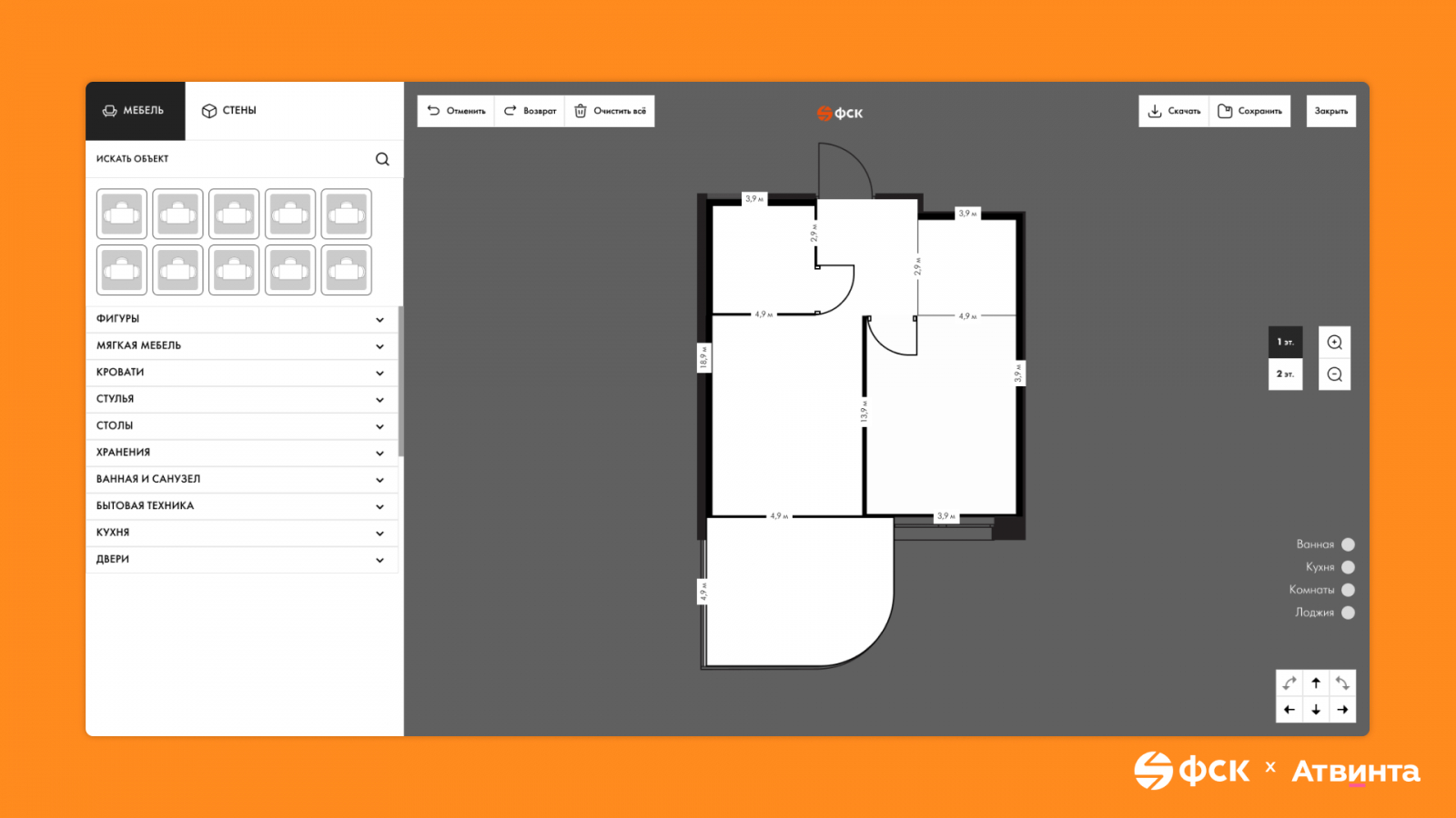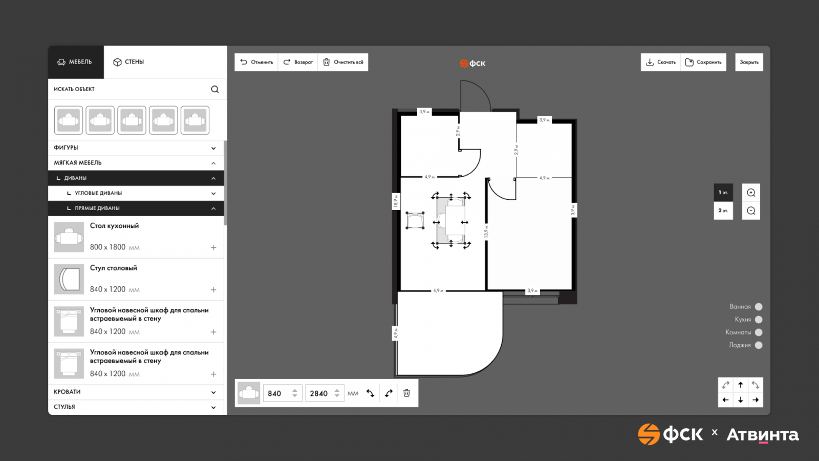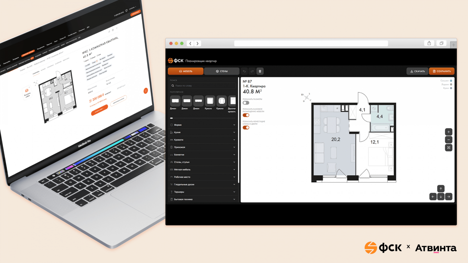 ГК ФСК обратились к нам в прошлом году. Команде понравились наши проекты и внимательное отношение на преселейсе. Поэтому компания доверила нам реализацию свежей идеи на рынке девелопмента — ГК ФСК одна из первых решила добавить на сайт модуль, в котором клиенты могут сами установить стены и обставить квартиру на реальном планировочном решении.