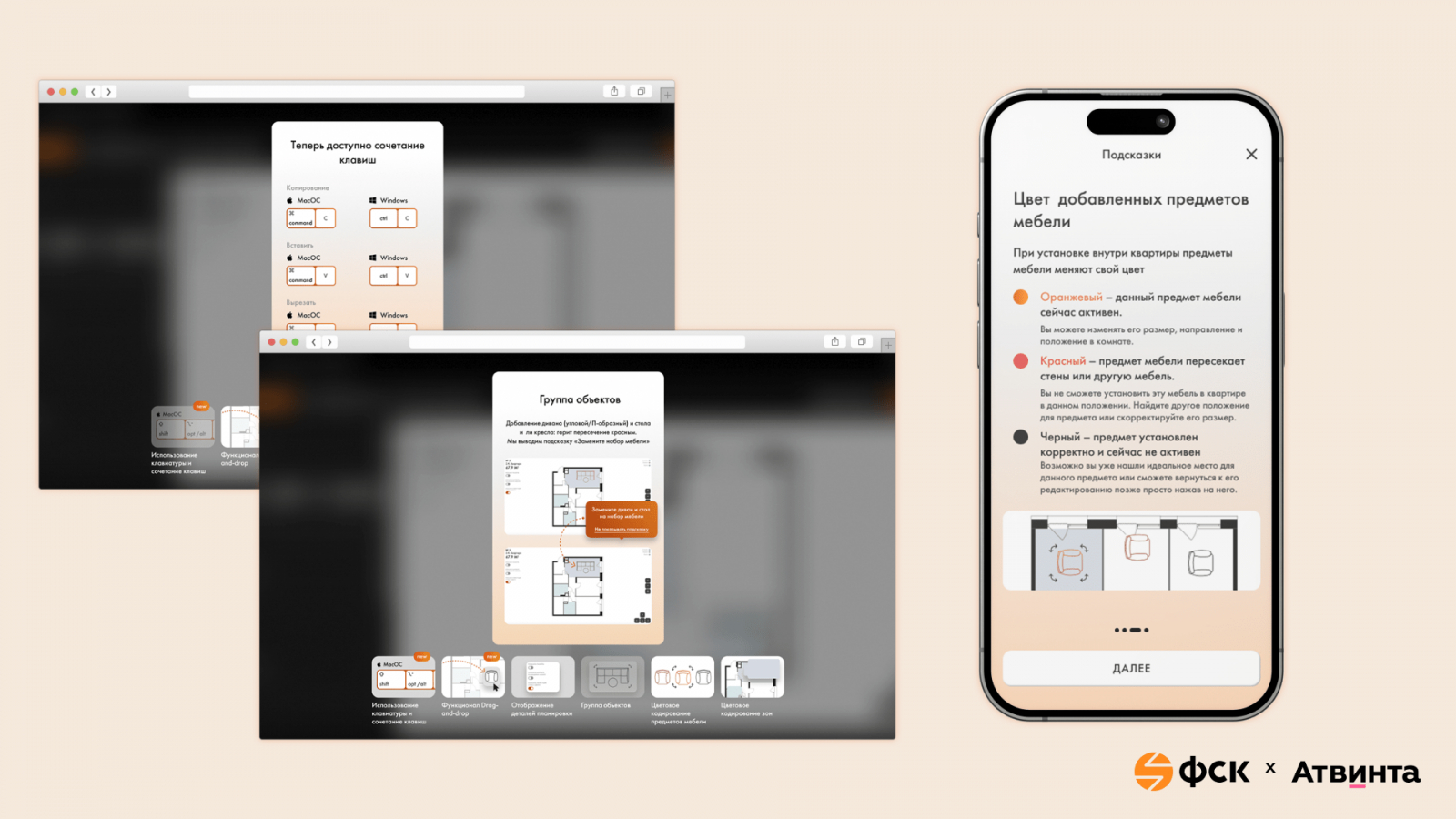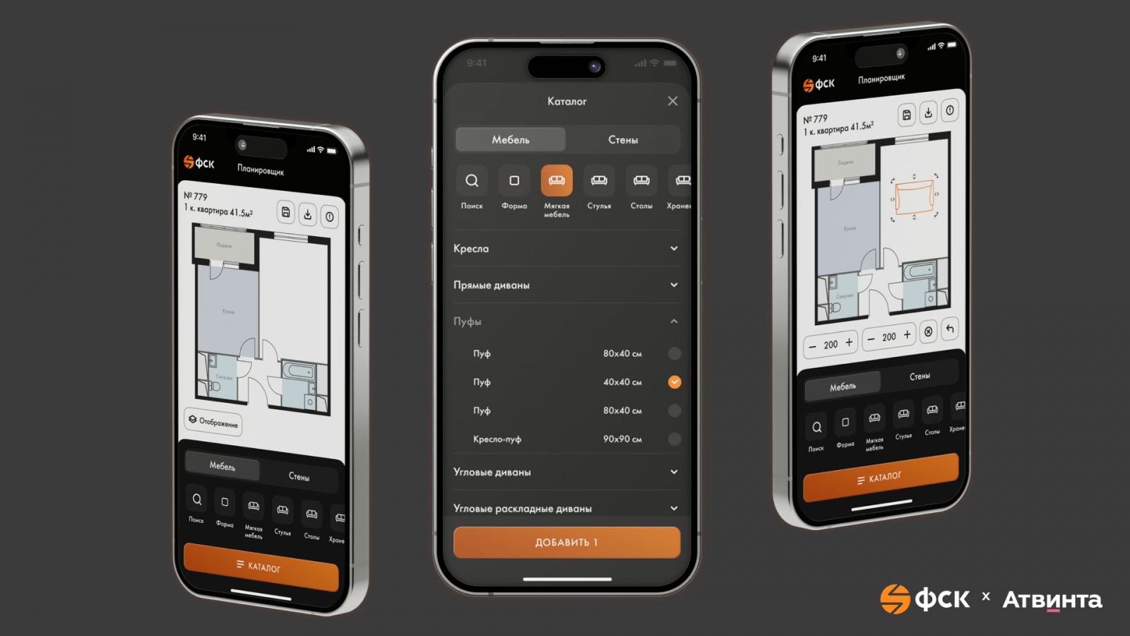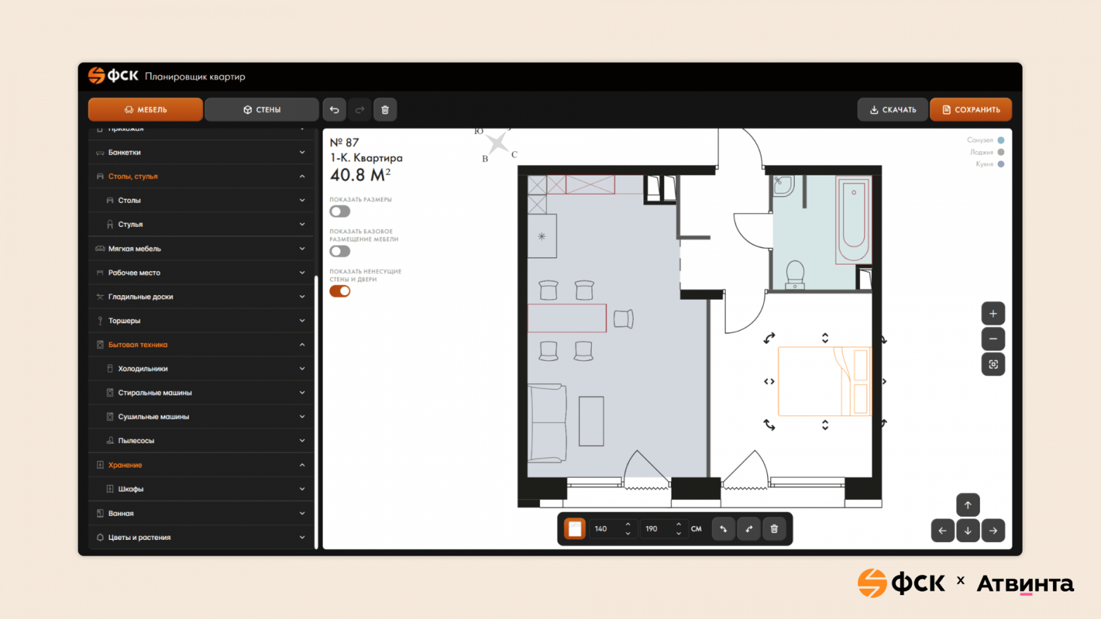 ГК ФСК обратились к нам в прошлом году. Команде понравились наши проекты и внимательное отношение на преселейсе. Поэтому компания доверила нам реализацию свежей идеи на рынке девелопмента — ГК ФСК одна из первых решила добавить на сайт модуль, в котором клиенты могут сами установить стены и обставить квартиру на реальном планировочном решении.