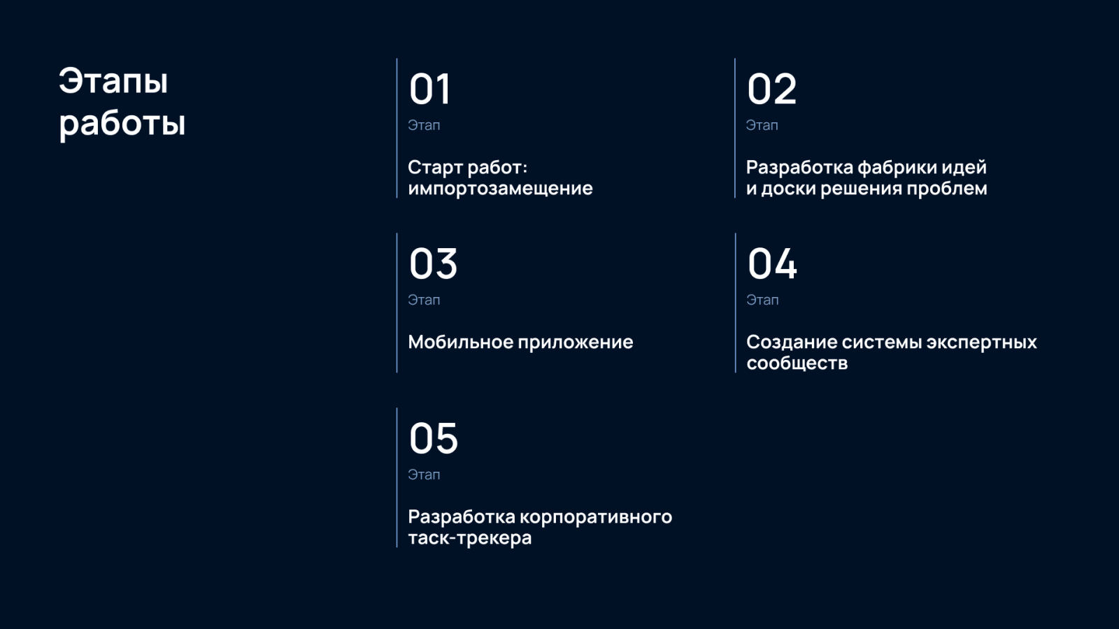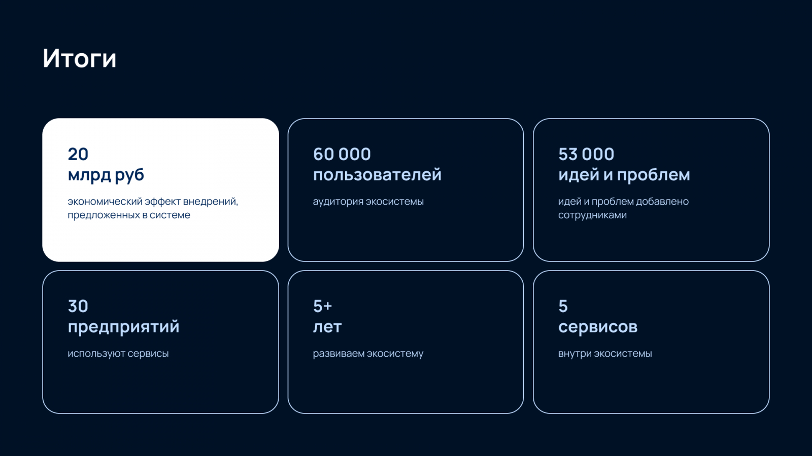 С нашей экосистемой заказчик перешел от разрозненных инструментов по всей группе компаний к единому цифровому пространству, которое закрывает все бизнес-процессы по фабрике идей и внедрению улучшений.