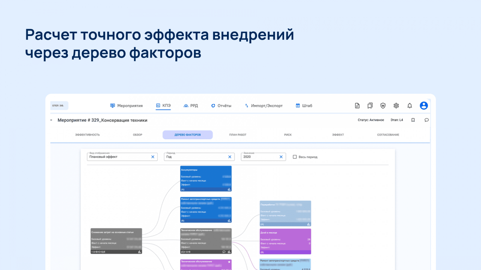 Клиент отмечает, что благодаря проработке дерева факторов наша система позволяет рассчитывать точный экономический эффект внедрений — а это одно из основных узких мест в концепции производственных улучшений.