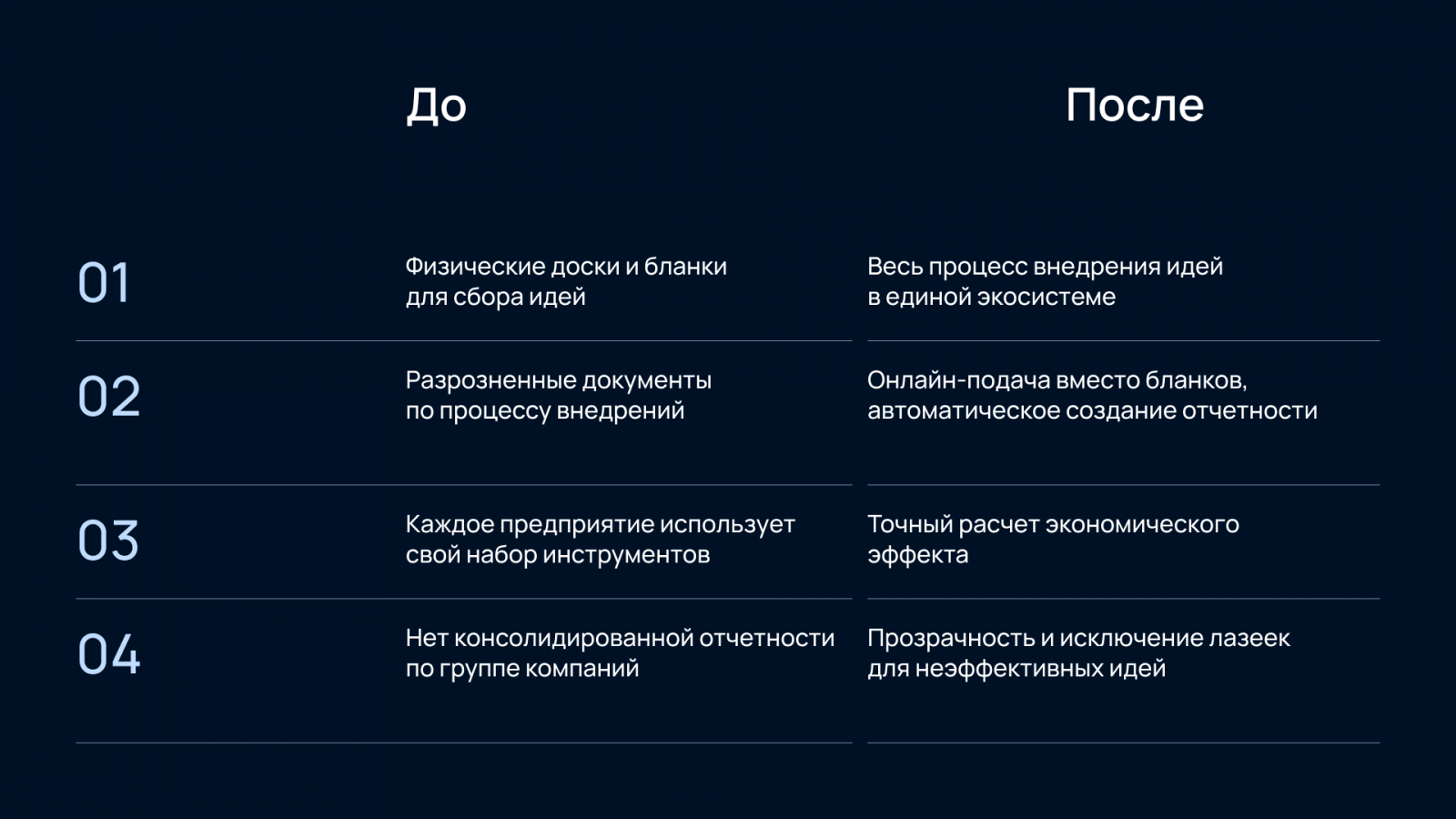 Полностью оцифровали внедрение улучшений на 30 предприятиях. Наша экосистема стала общим пространством для управления идеями от сотрудников и отслеживания их внедрения.