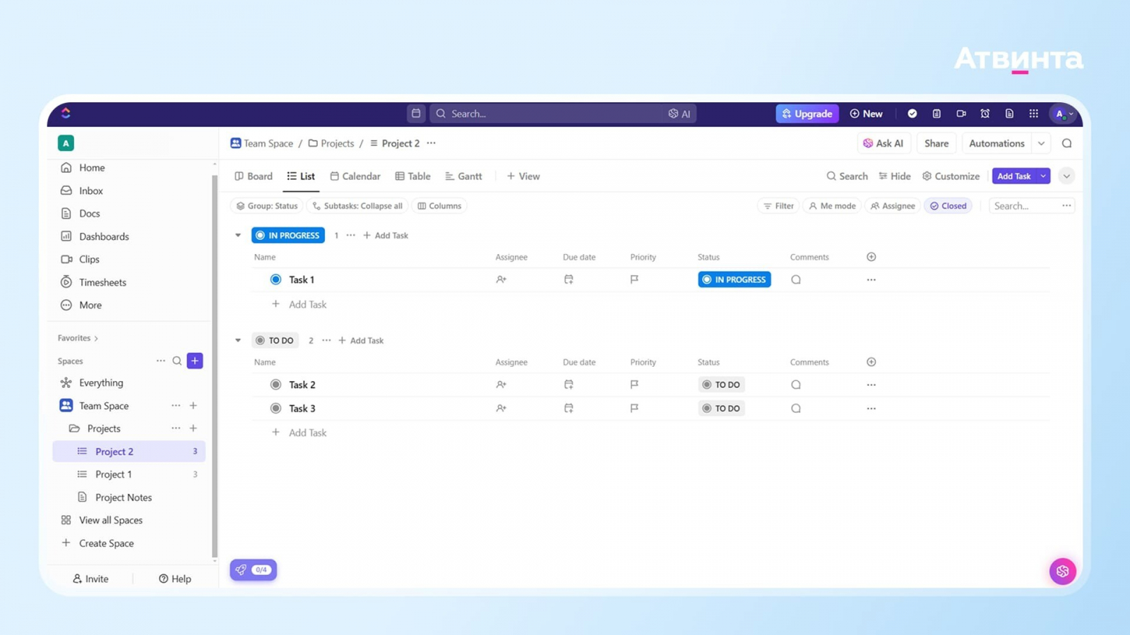 ClickUp — гибкое решение для бизнеса. Платформа предлагает широкую кастомизацию, продвинутую автоматизацию и поддержку AI.