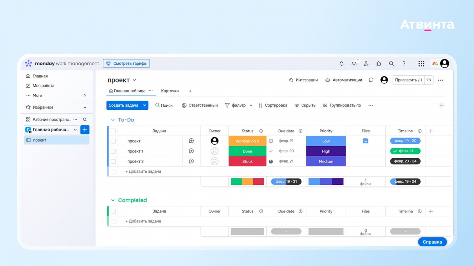 Monday.com предлагает удобную систему управления задачами и проектами. Его сильная сторона — автоматизация рабочих процессов и продвинутые фильтры. Площадка подойдет командам, которым нужно быстро сортировать подзадачи и настраивать автоматические сценарии, но в гибкости кастомизации она уступает тому же ClickUp.