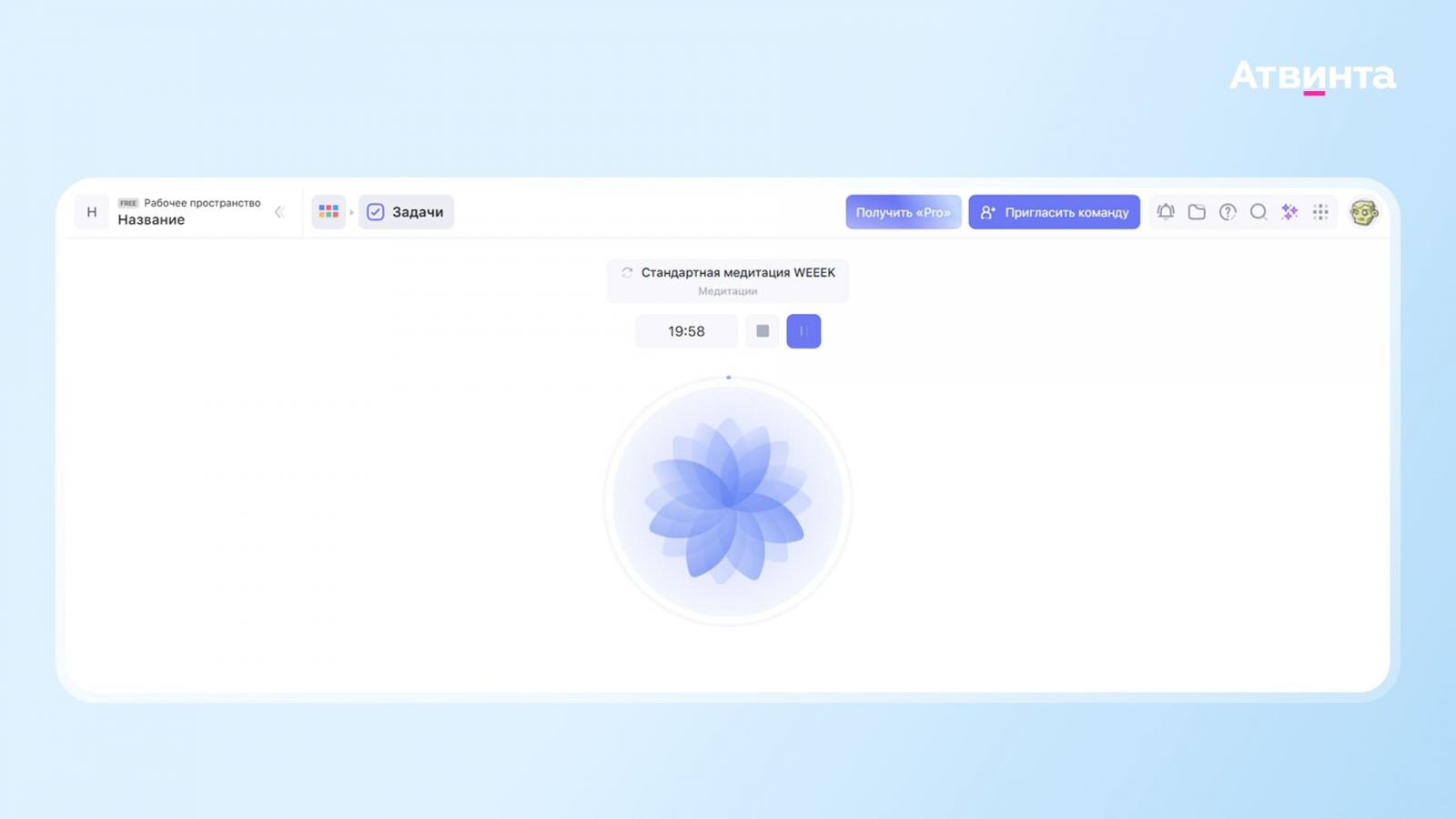 Наличие микросервиса медитаций. Пока это статичная анимация, но разработчики планируют добавить аудиосопровождение. Функция помогает снизить стресс, восстановиться после сложных задач и поддерживать концентрацию на протяжении рабочего дня.