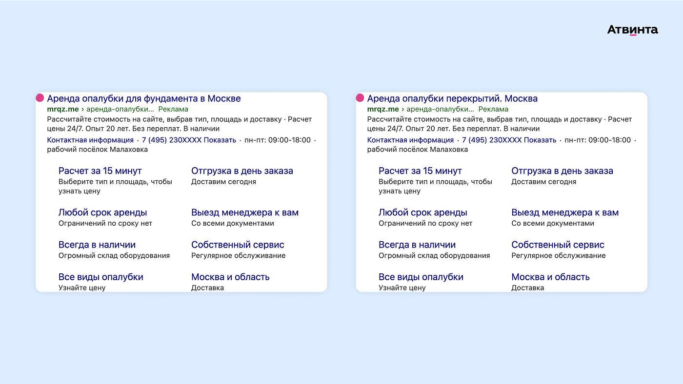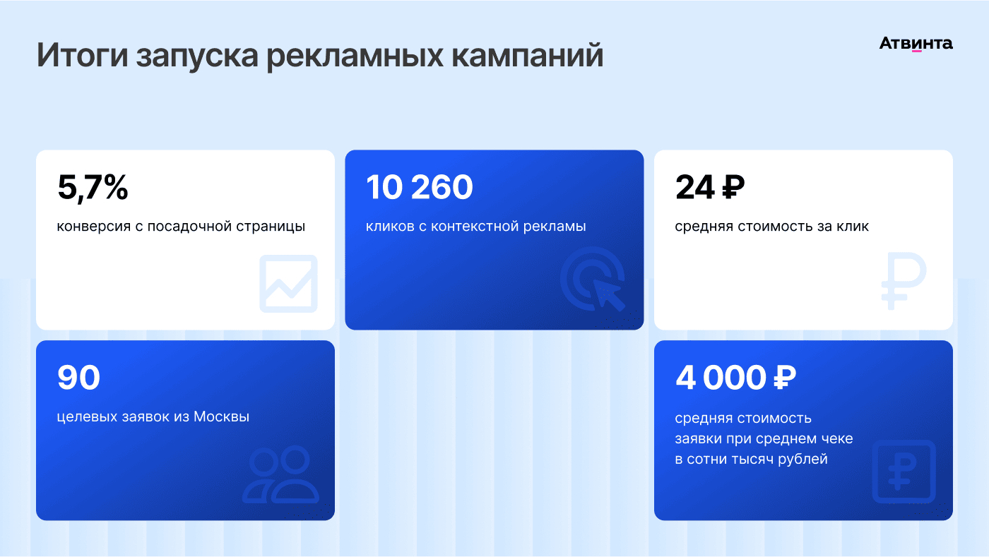 Учли сезонность спроса в строительной сфере. Зимой интерес к стандартной опалубке снижается, зато растет потребность в специфических решениях — станциях прогрева, ЗУС и других. Под каждый такой сегмент запустили отдельные кампании с адаптированными посадочными страницами и текстами объявлений. Это позволило сохранить стабильный поток лидов даже в межсезонье.