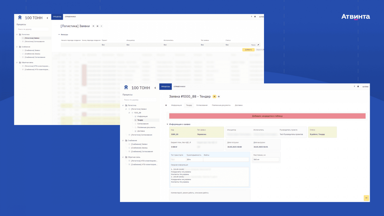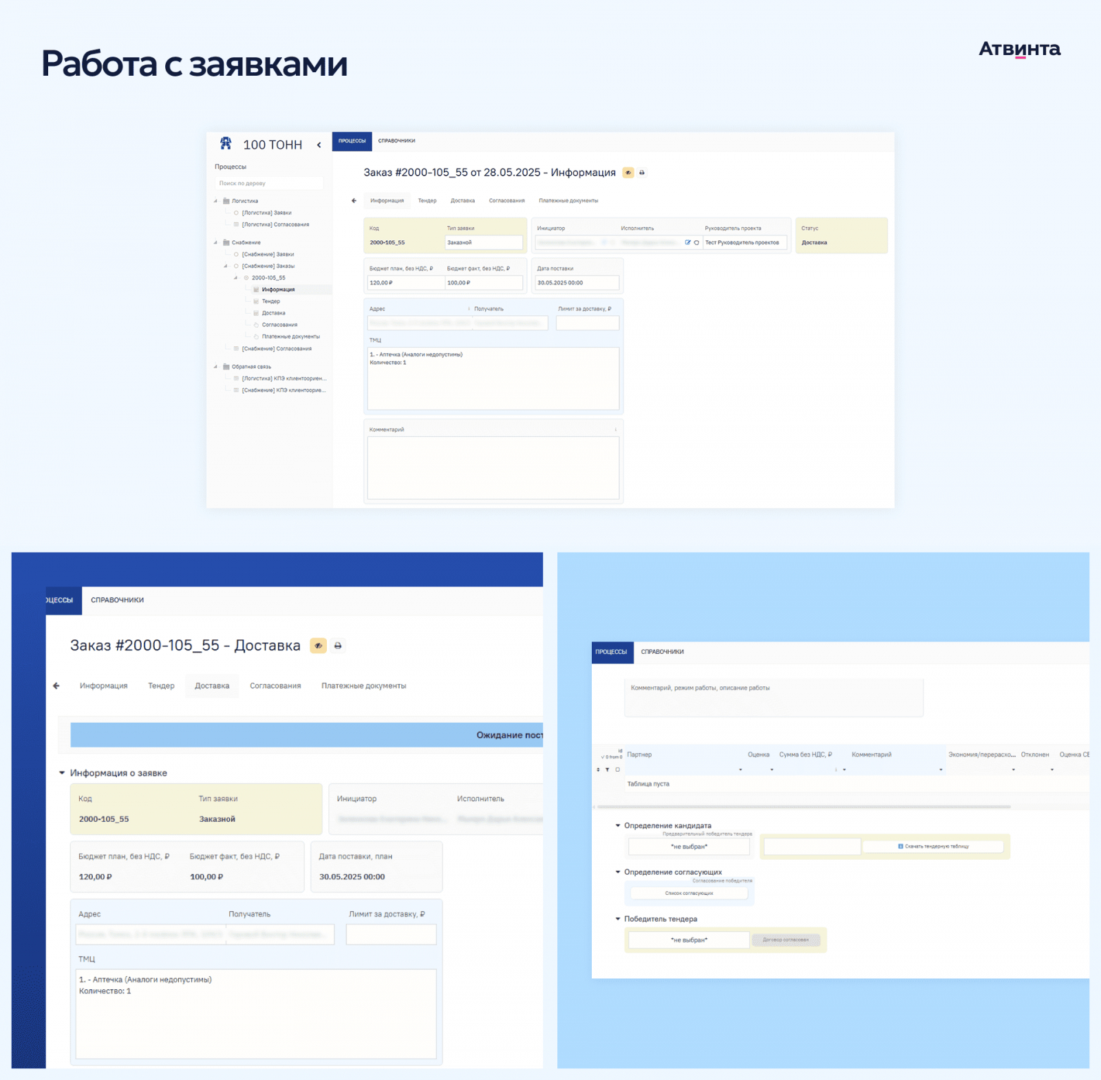 Исполнители работают по сценарию: создают заявку, запускают тендер и фиксируют победителя. Все это сопровождается автоматическими переходами и системой контроля. Это позволяет бизнесу избежать потерь, связанных с ручным вводом и несогласованностью действий отдельных команд.