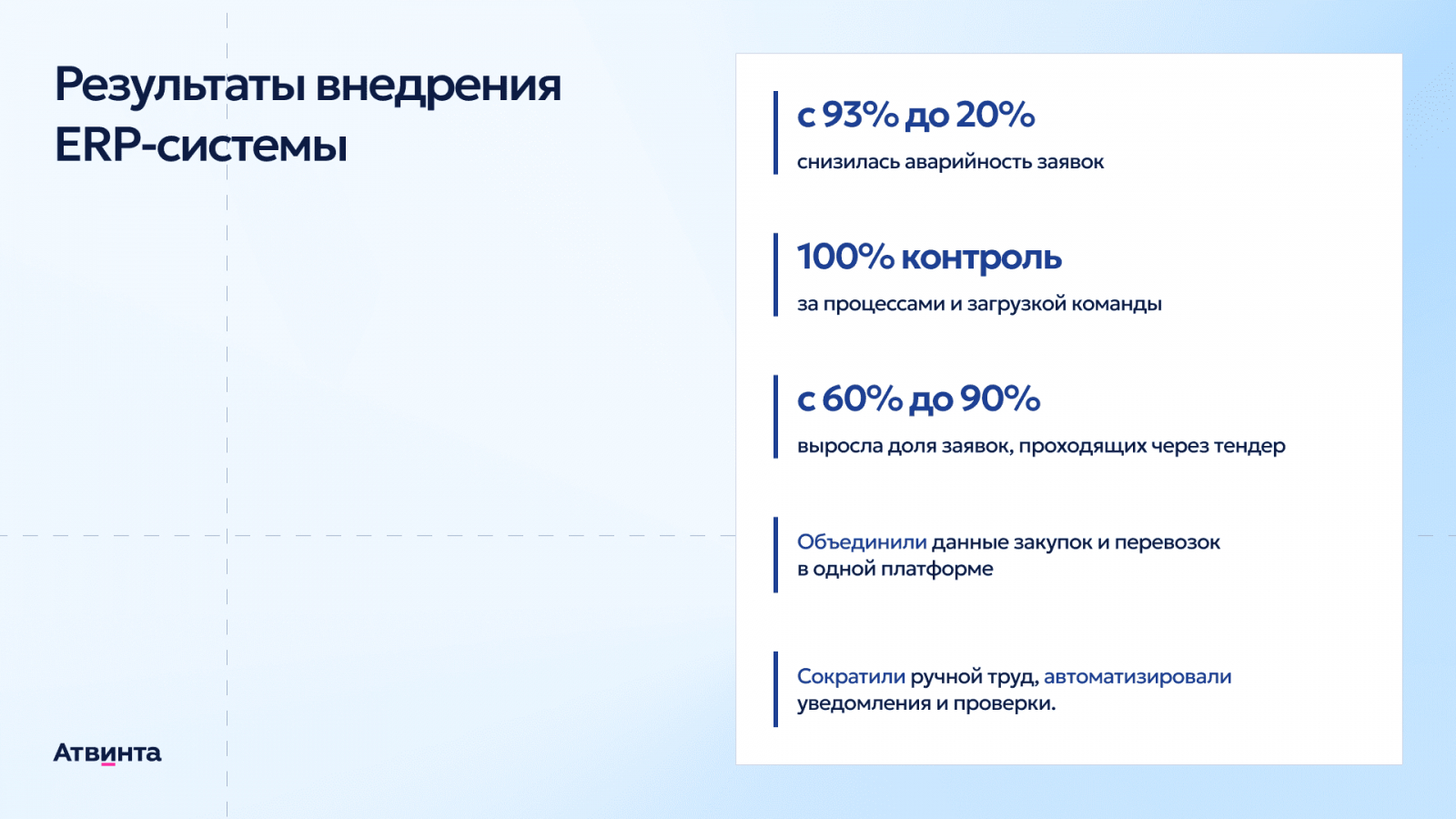 Платформа объединила закупки и перевозки, автоматизировала рутинные задачи и задала единый порядок действий для всех ролей в компании.