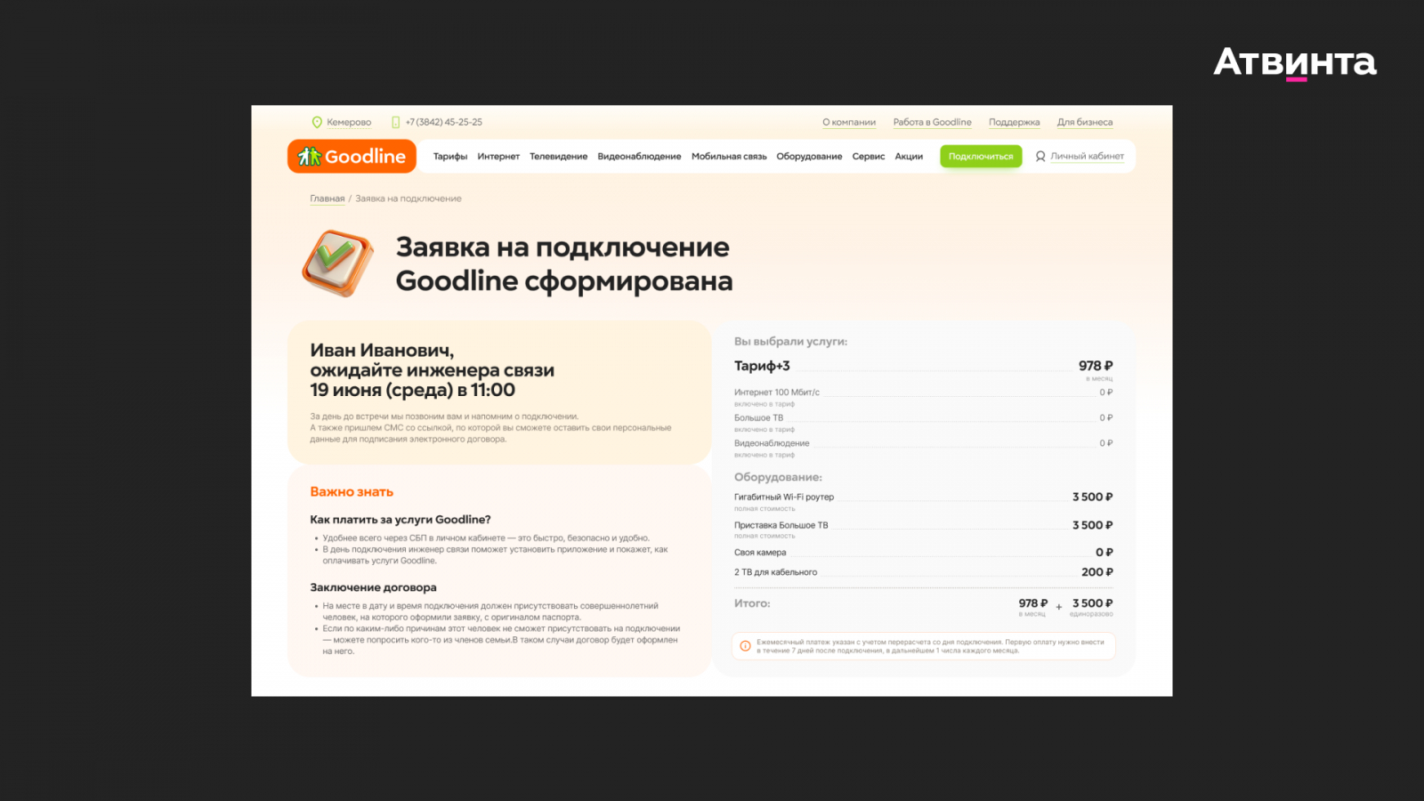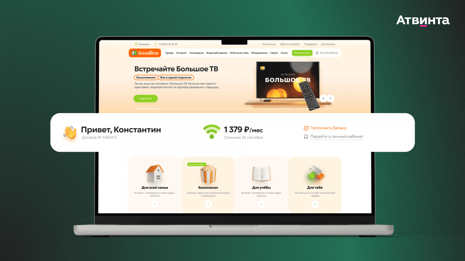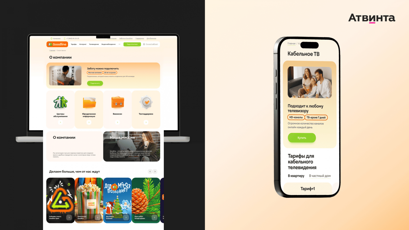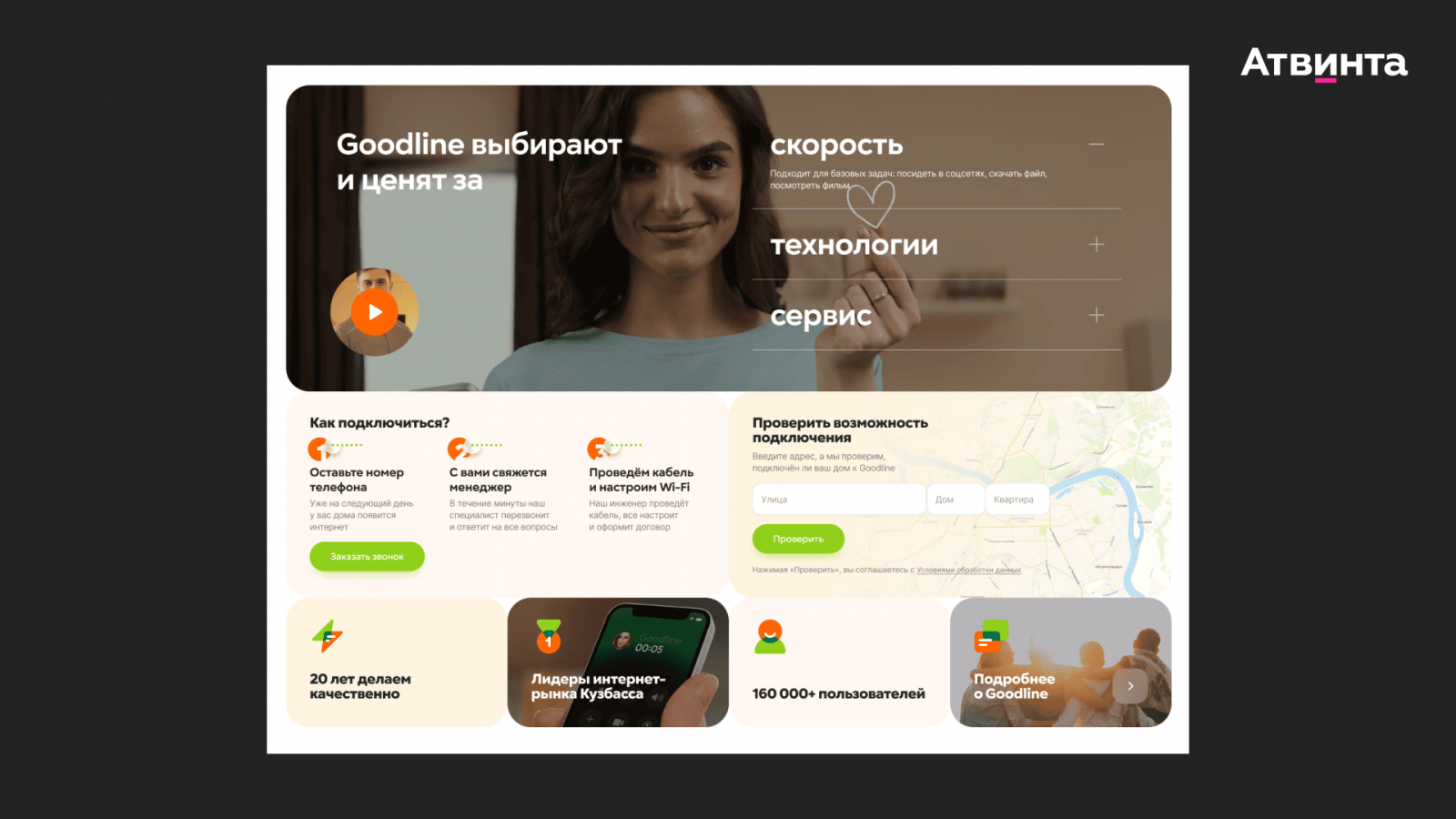Goodline и Атвинта создали новый B2C-сайт компании, где улучшен пользовательский опыт, реализован современный дизайн, добавлены маркетинговые инструменты, удобный конструктор тарифов и самостоятельное подключение заявки.