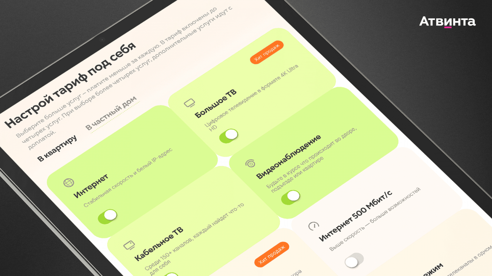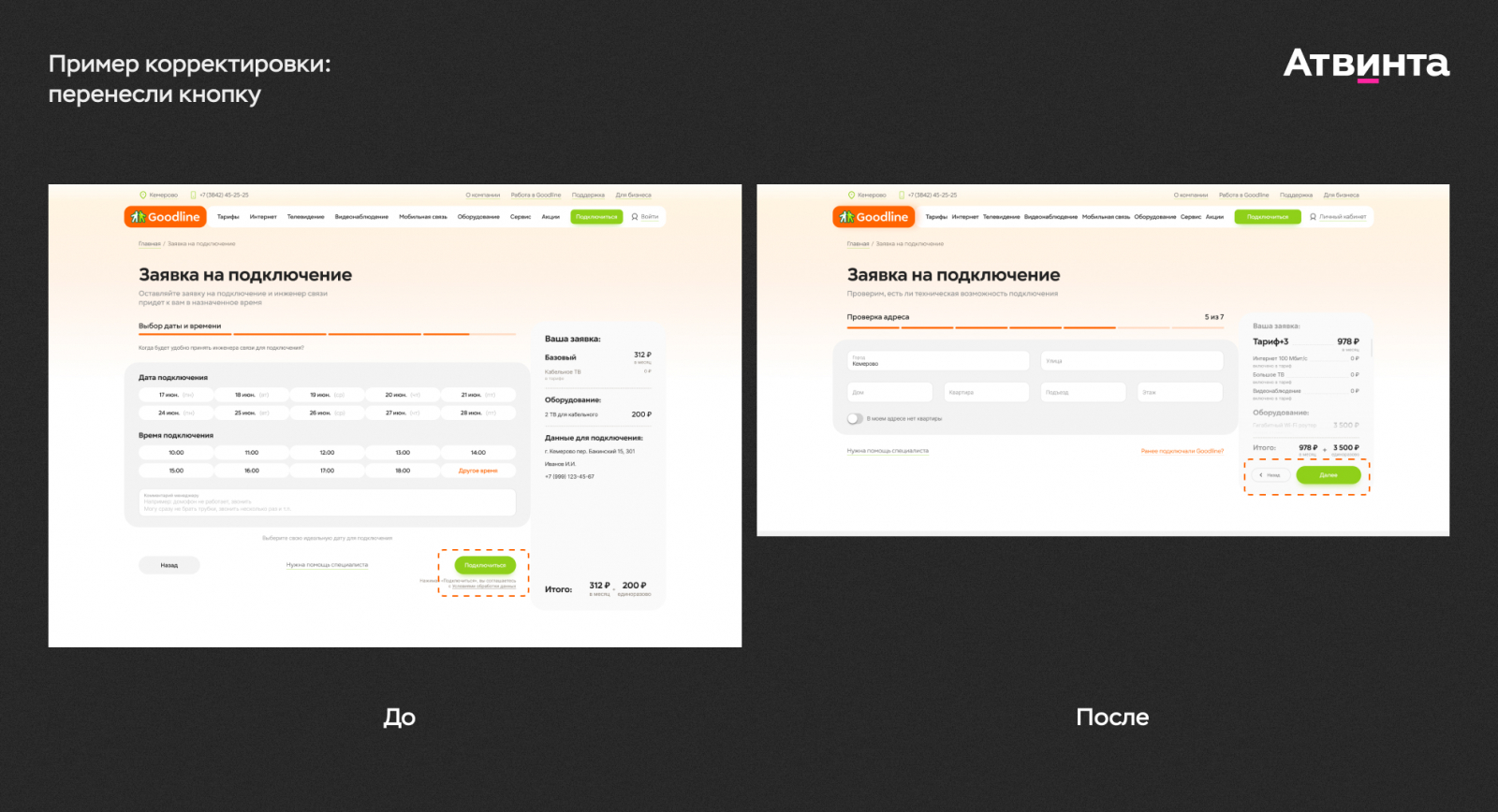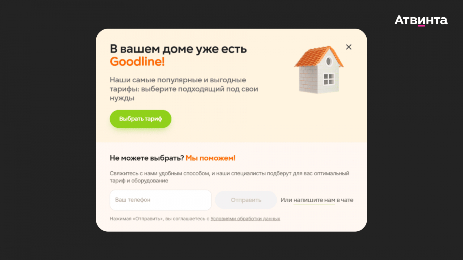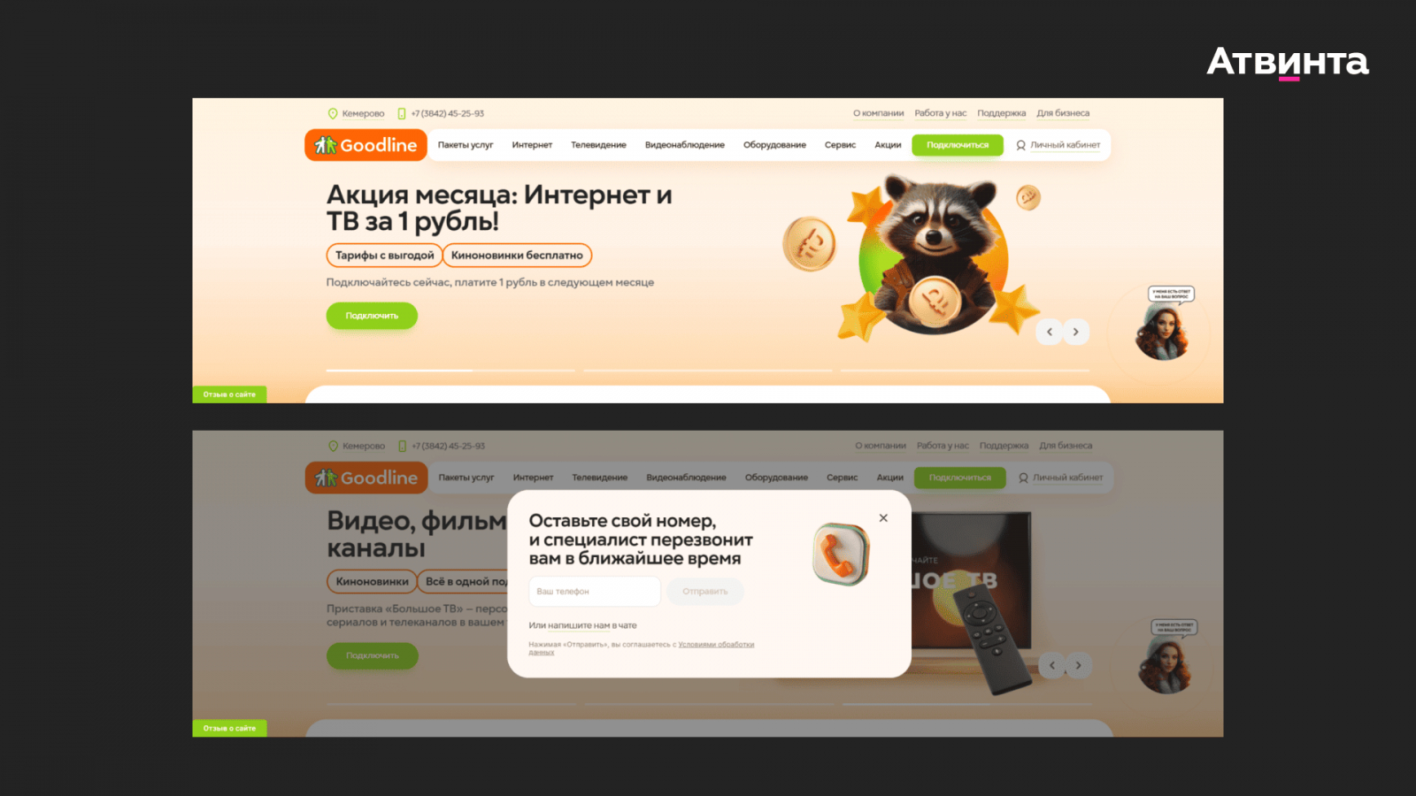 Goodline и Атвинта создали новый B2C-сайт компании, где улучшен пользовательский опыт, реализован современный дизайн, добавлены маркетинговые инструменты, удобный конструктор тарифов и самостоятельное подключение заявки.