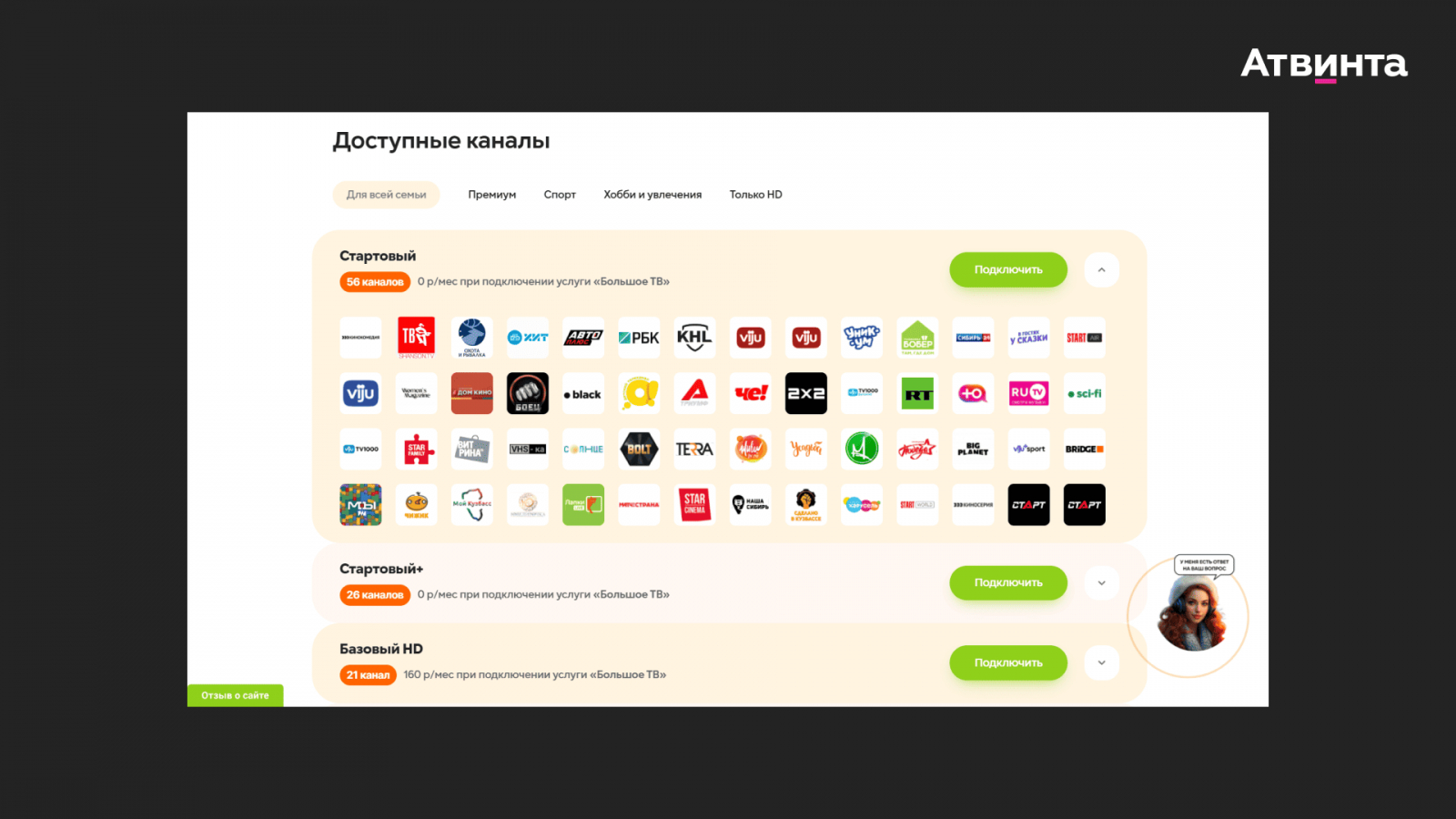 В линейке Goodline 3 флагманских продукта: интернет, ТВ и видеонаблюдение. Это разные услуги со своей спецификой и нюансами. Для каждой из них проработана отдельная структура. Например, на странице телевидения есть блоки с преимуществами подписки, набором каналов, бонусами (квизы, караоке) и каталогом приставок, которые нужны для подключения.
